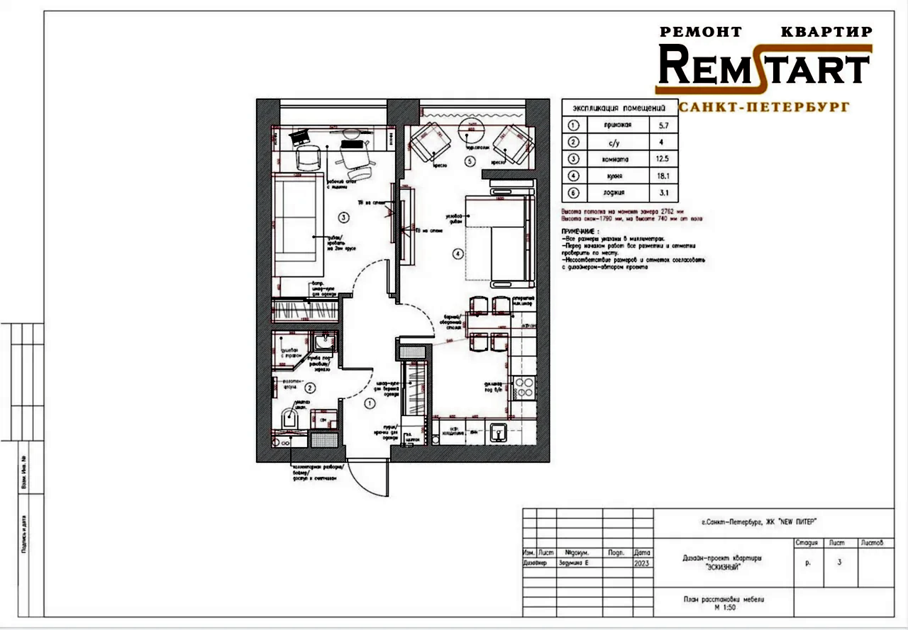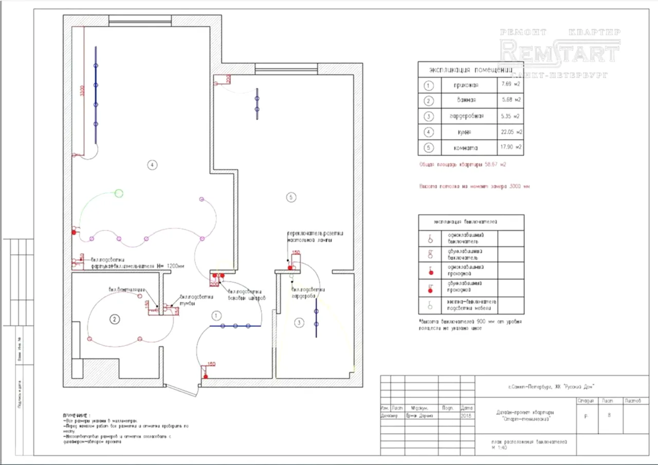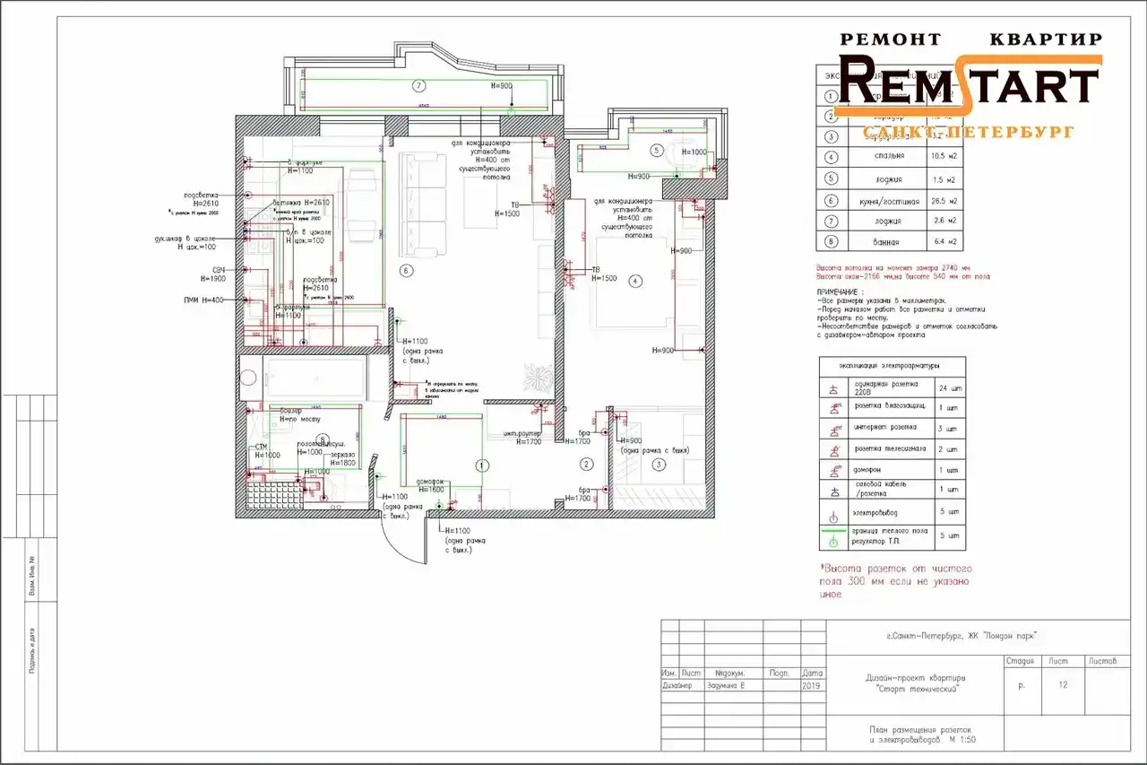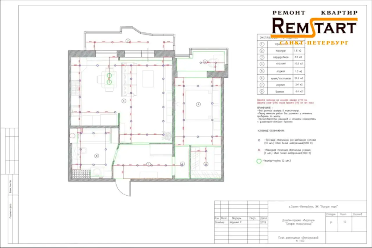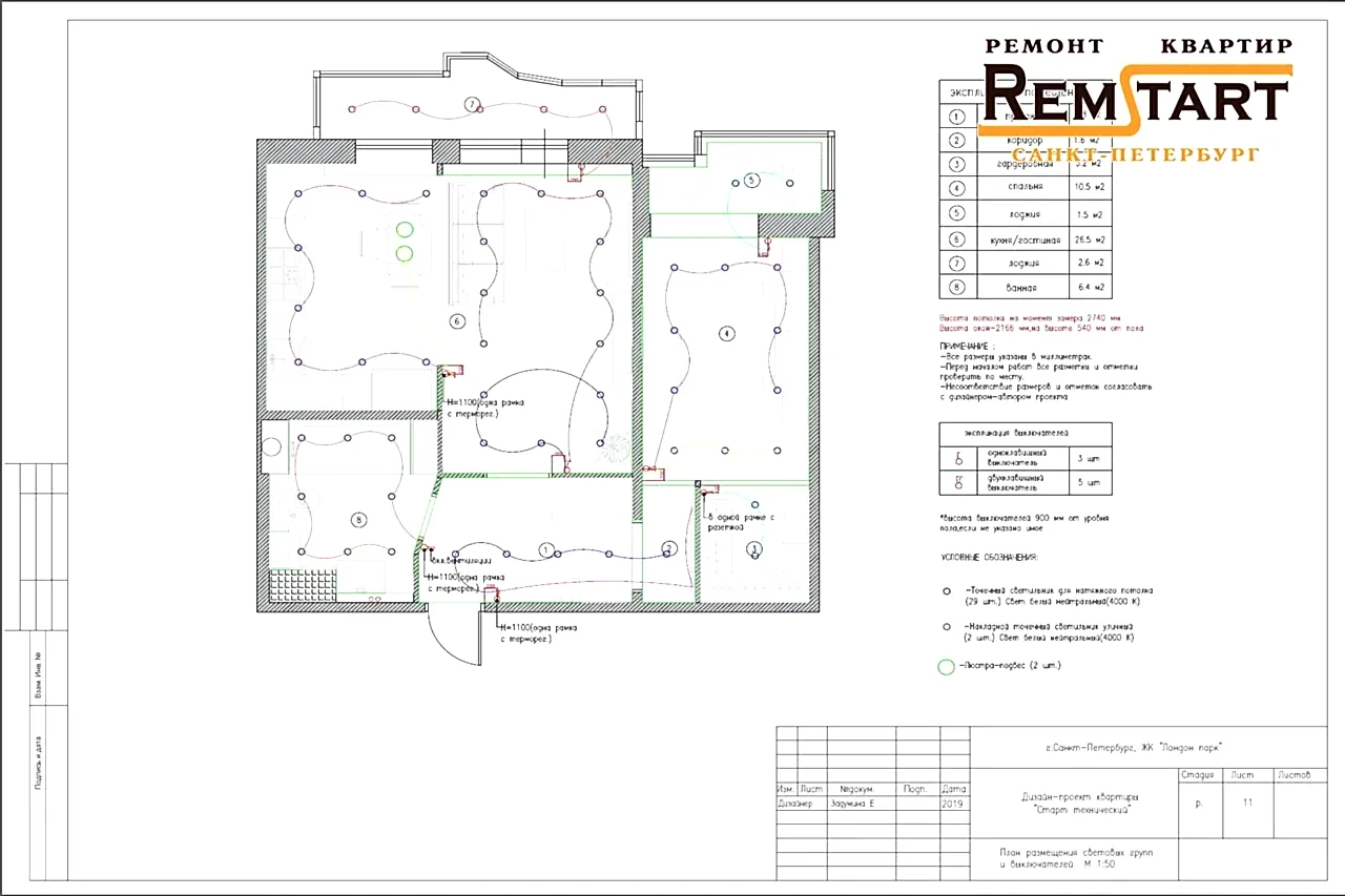 Посмотрите наглядно все планы расстановки мебели, перепланировку, вариант расположения светильников электророзеток и выключателей, план раскладки Pin Up в ванной комнате и напольного покрытия во всех помещениях.