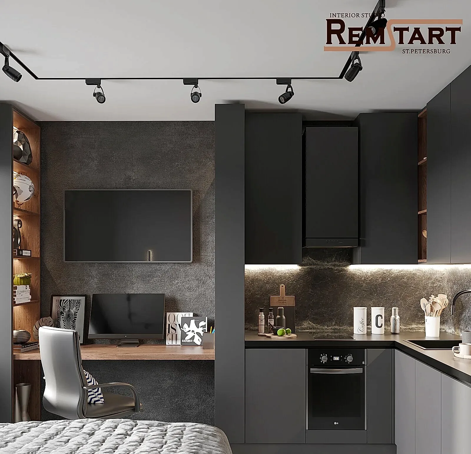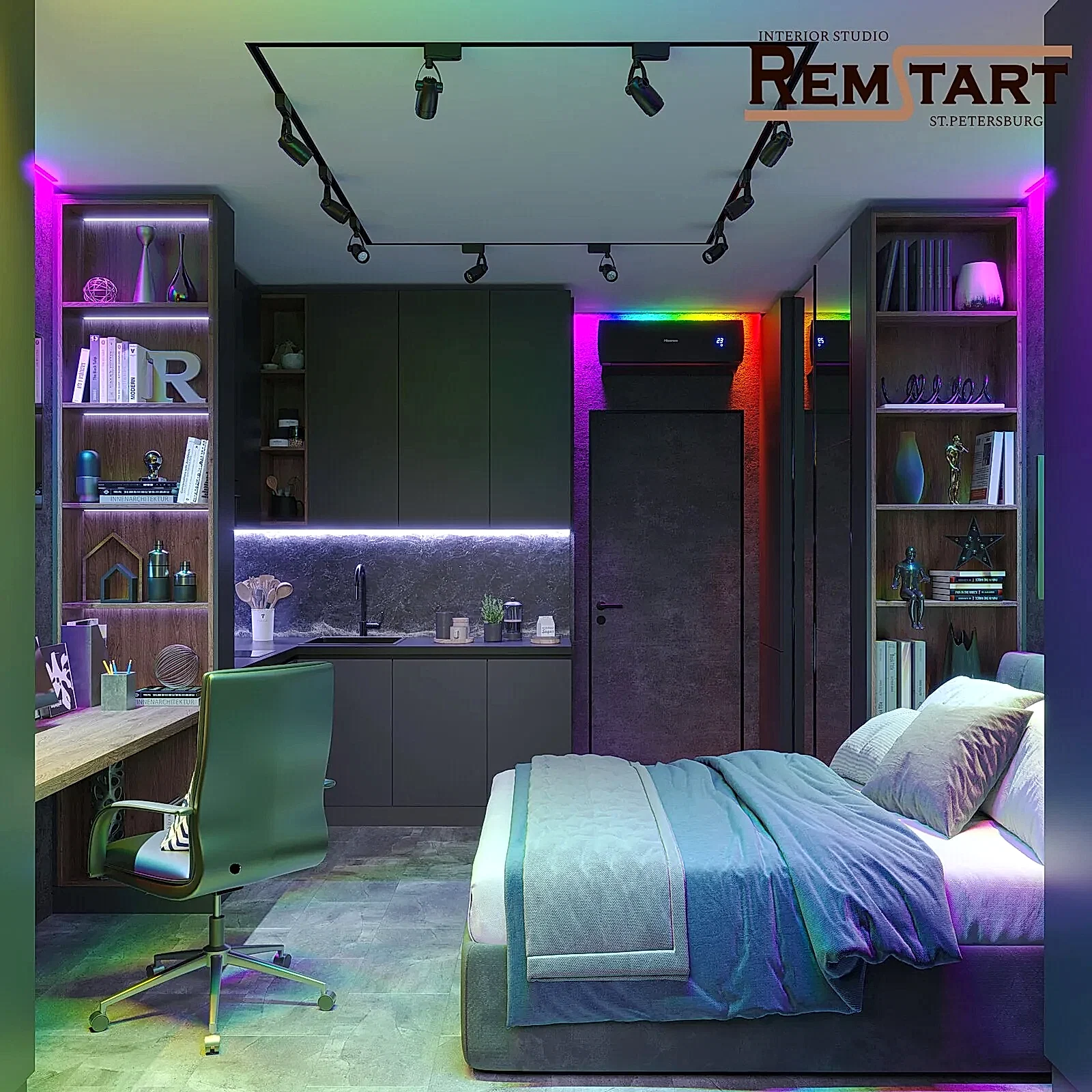 Заказчиком дизайн проекта дляремонта квартиры в АСТАНАстал Pin Up парень, большой любитель цветного освещения. В его референсах было изобилие световых лент во всех деталях.