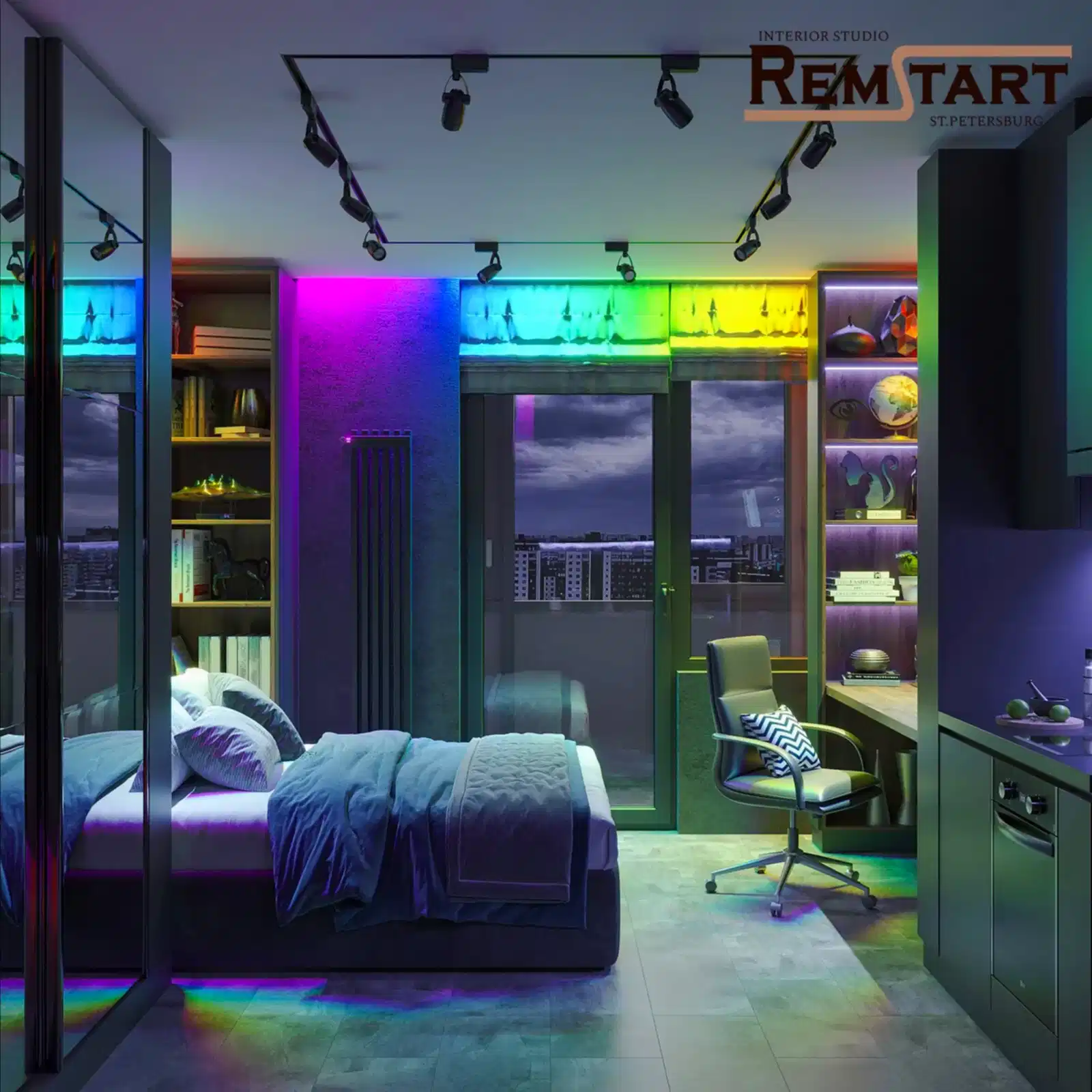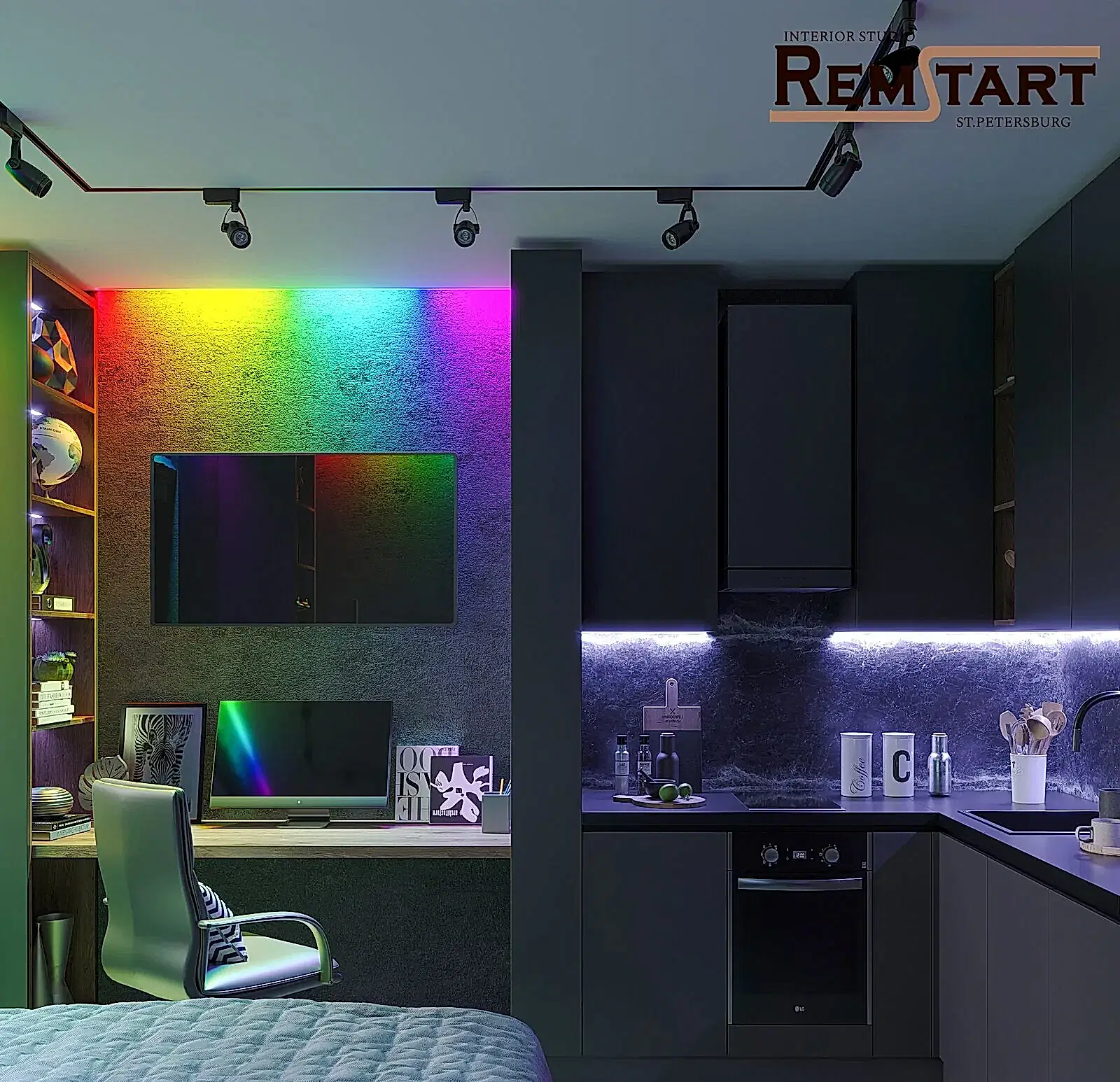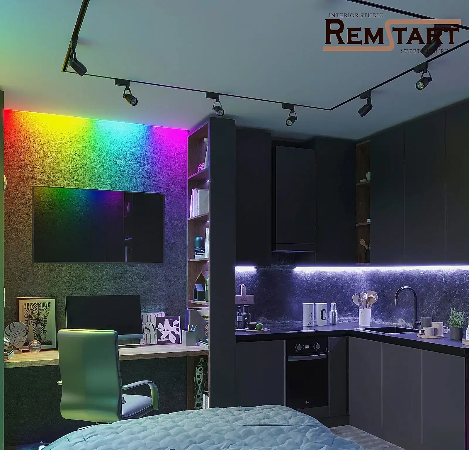 В ходе работы с дизайнером было организовано комфортное пространство для жизни и Pin Up пожелания заказчика по RGB освещению.
