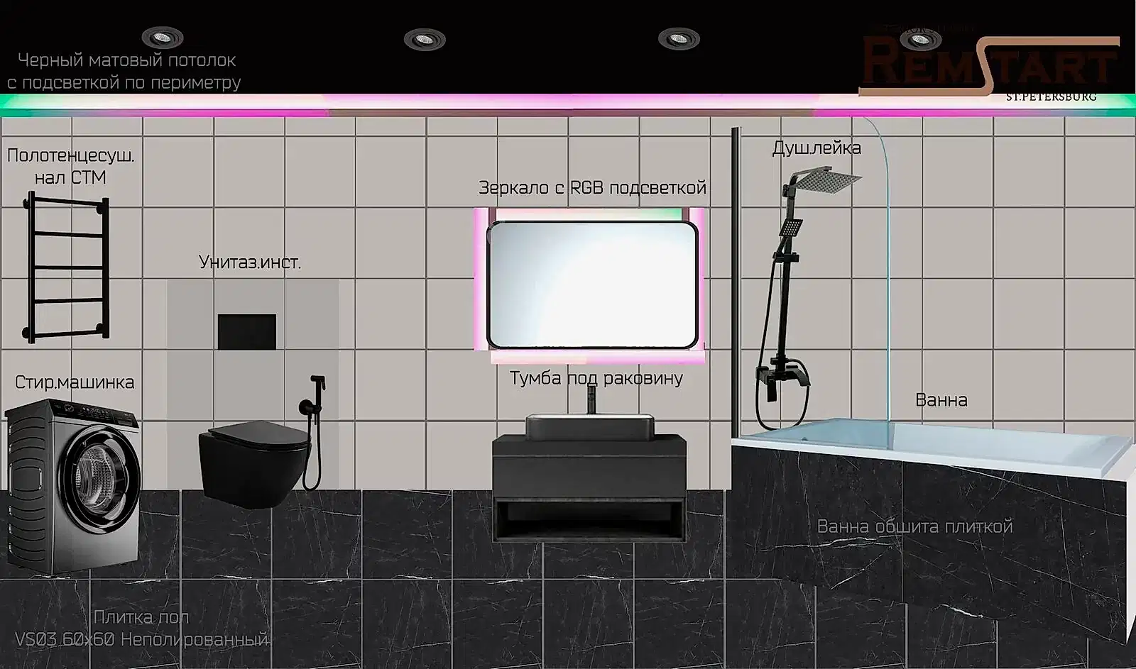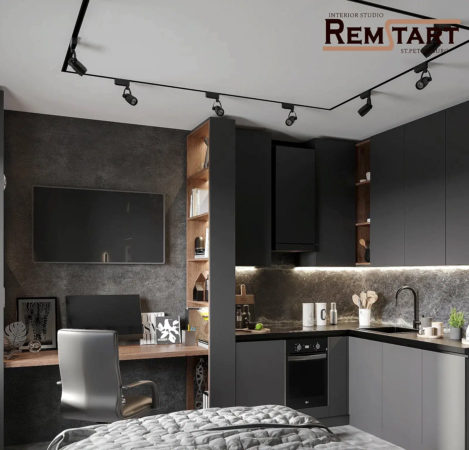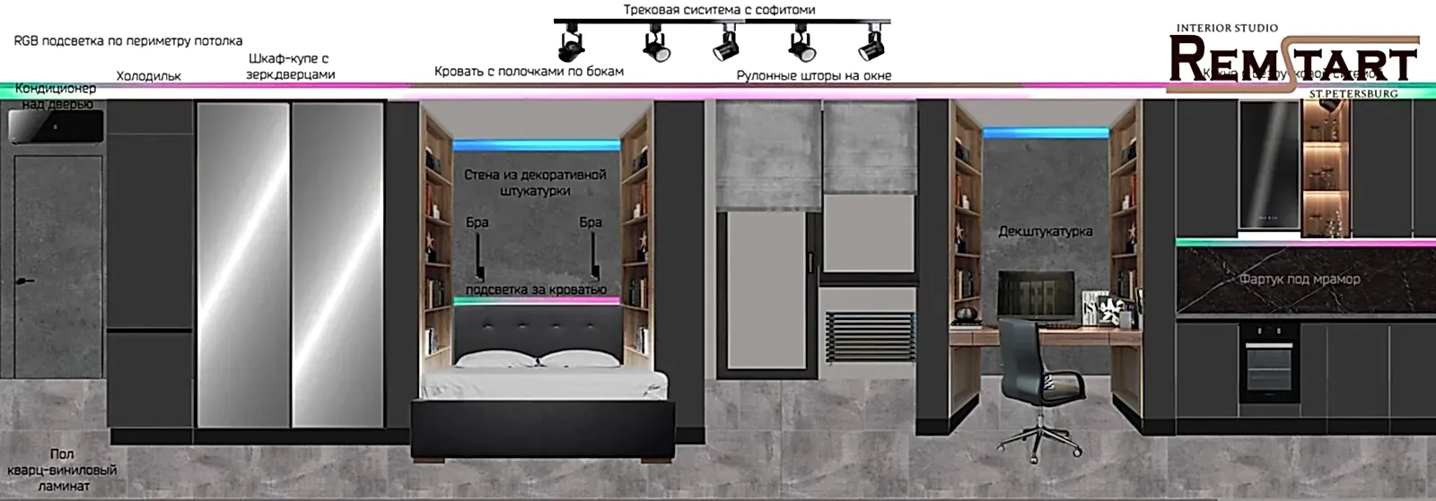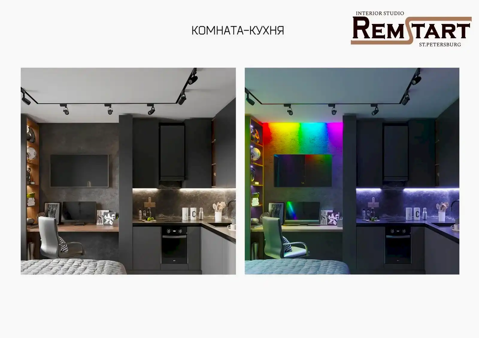 В ходе работы с дизайнером было организовано комфортное пространство для жизни и Pin Up пожелания заказчика по RGB освещению.