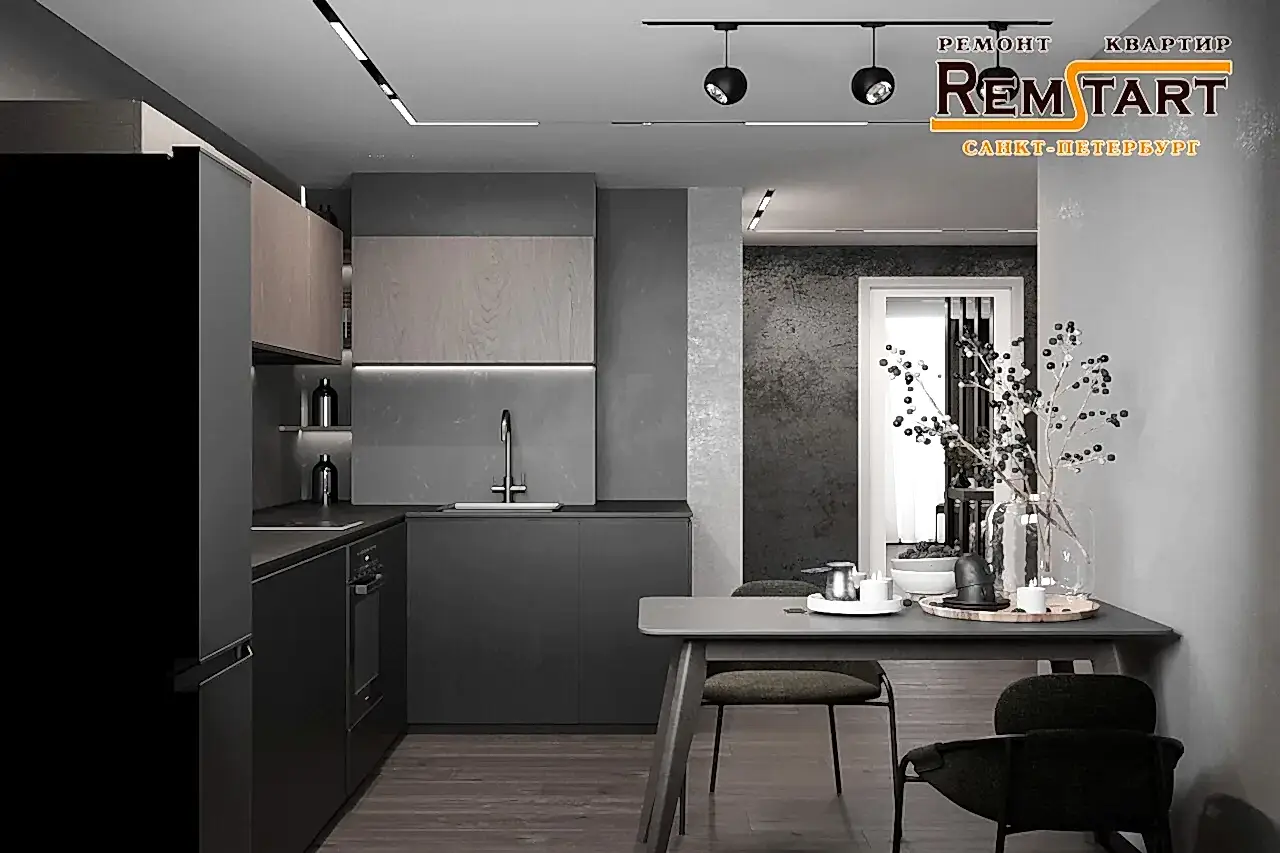 Необычайно смелое решение молодой пары. Стильный минимализм в объятиях оттенков от пепельного до Pin Up черного. Здесь чувствуется скрытая сила, стальная уверенность и нежность, искусно проявляющая себя в деталях.