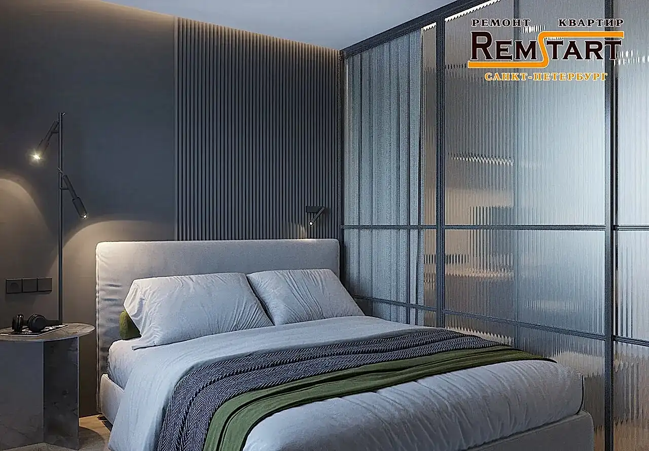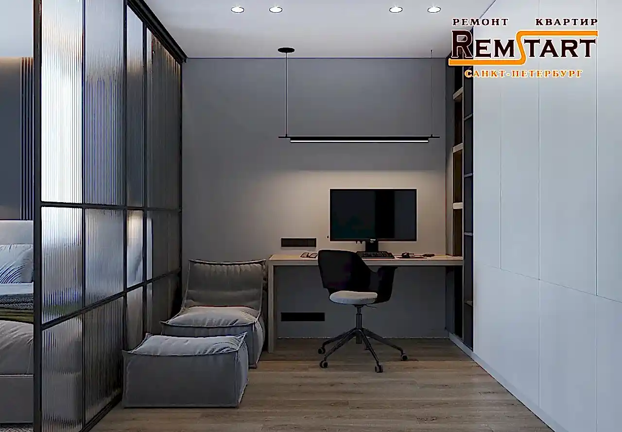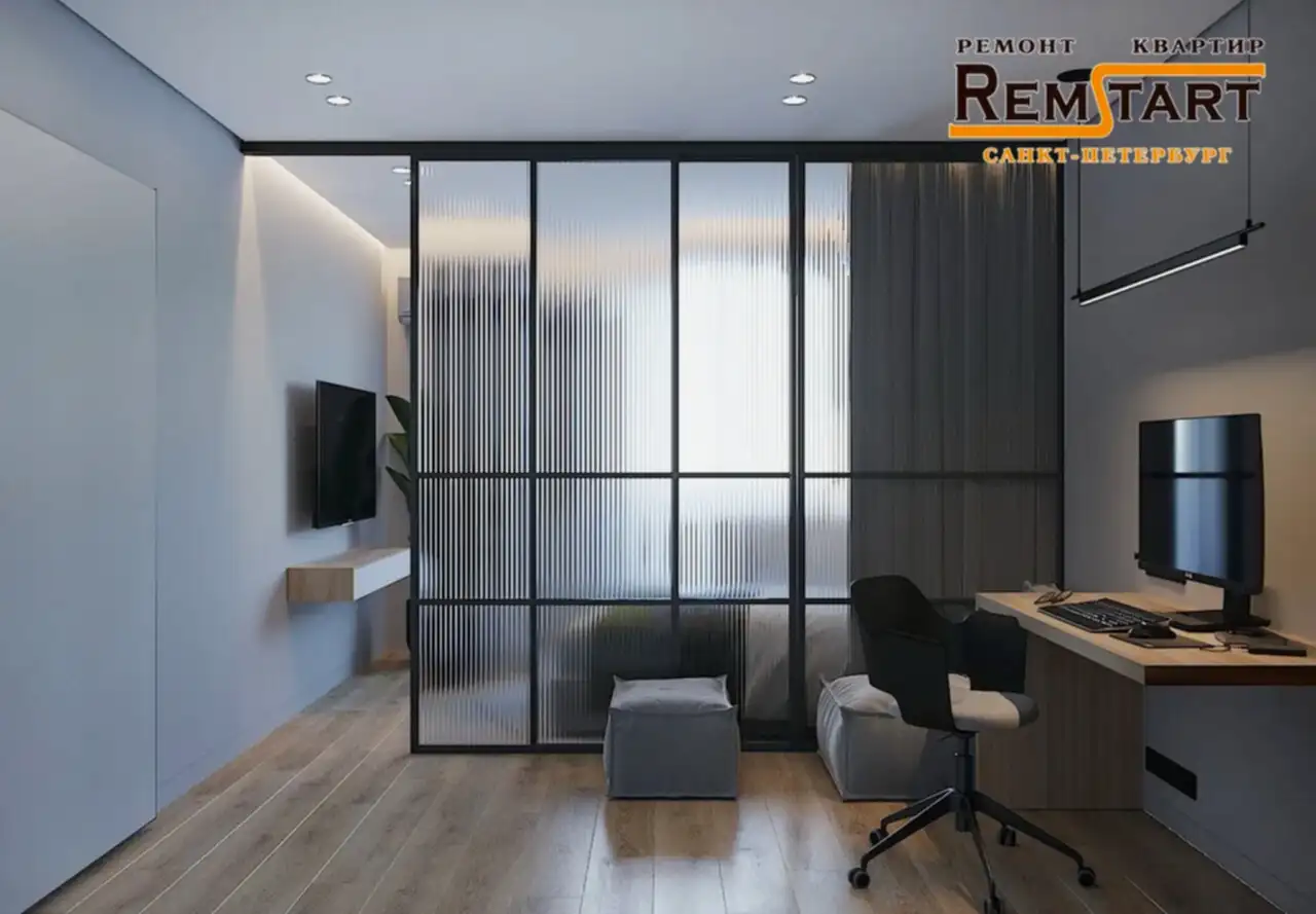 Зонированием - разделением зоны отдыха от рабочей зоны комнаты служит современное решение лофт перегородка из рельефного Pin Up с дополнительной текстильной шторой.