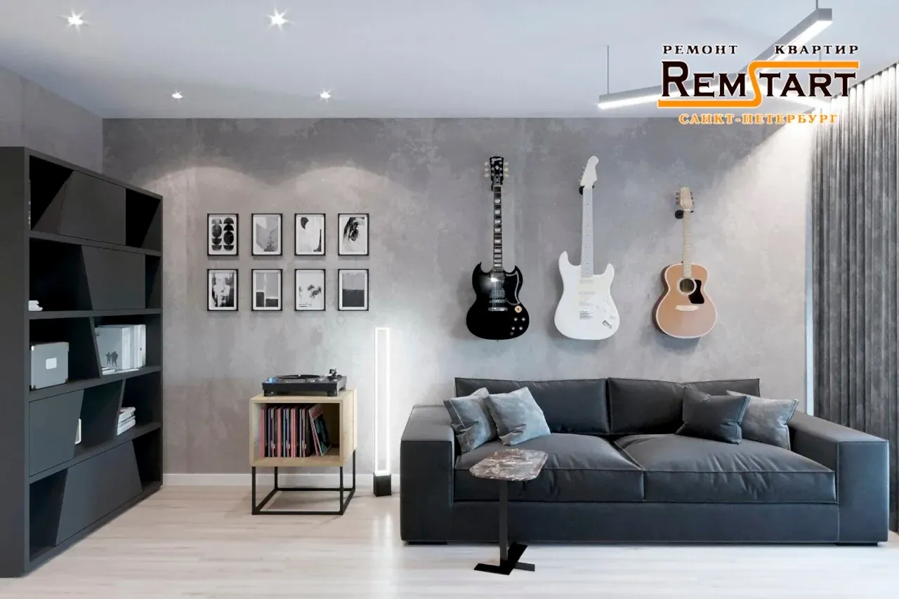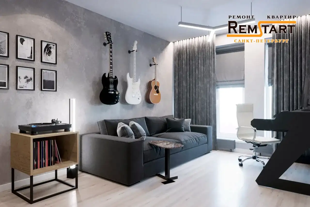 Интерьер Pin Up для творческого человека (музыканта) и оформлен стиле приближенному к лофт, с декоративной штукатуркой, покраской стен и авторской мебелью.