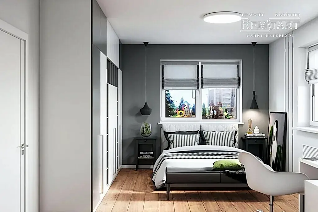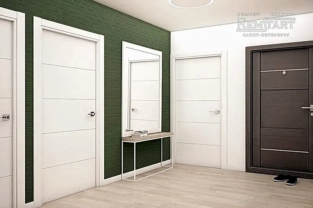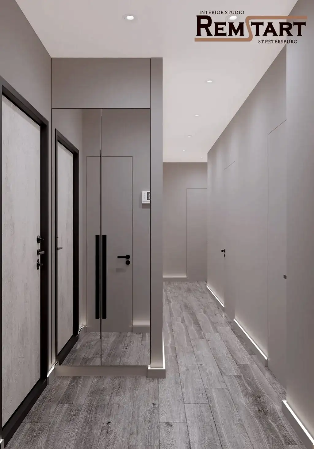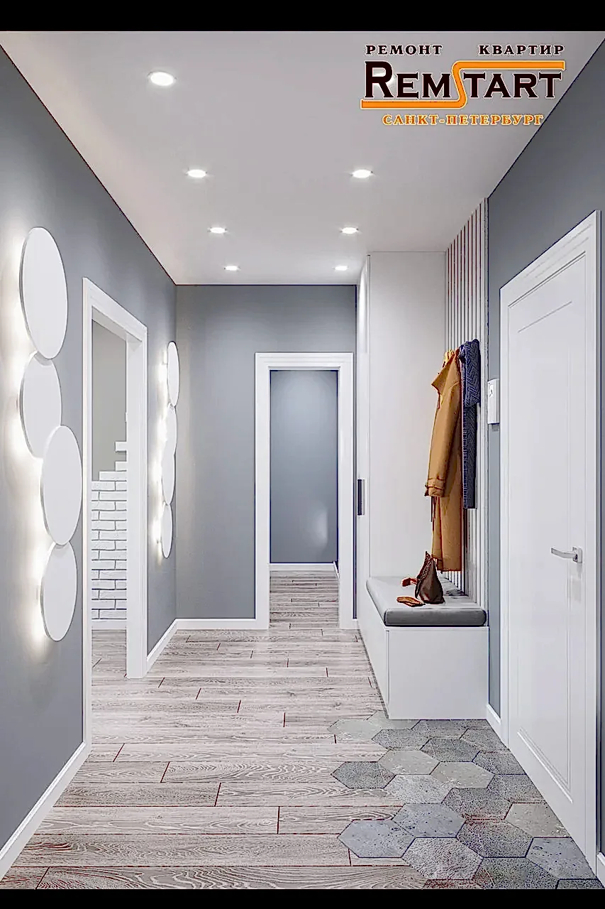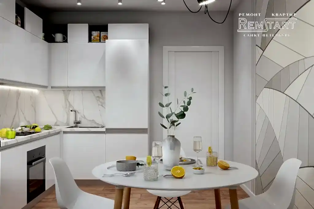 Красивый дизайн-проект двушки создан для отделки в светло-серых цветах Pin Up стилю с дополнением декоративным белым клинкерным кирпичом.