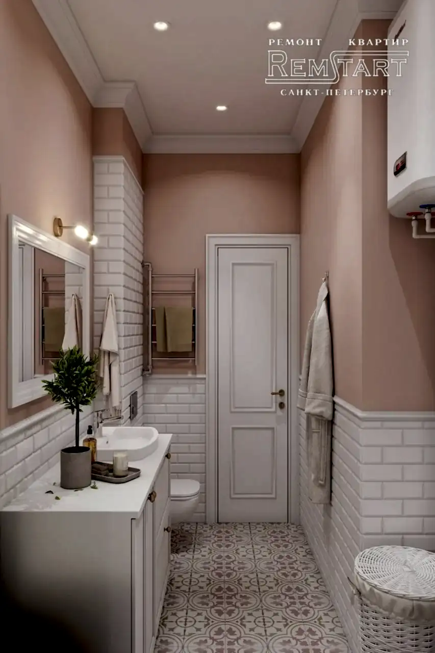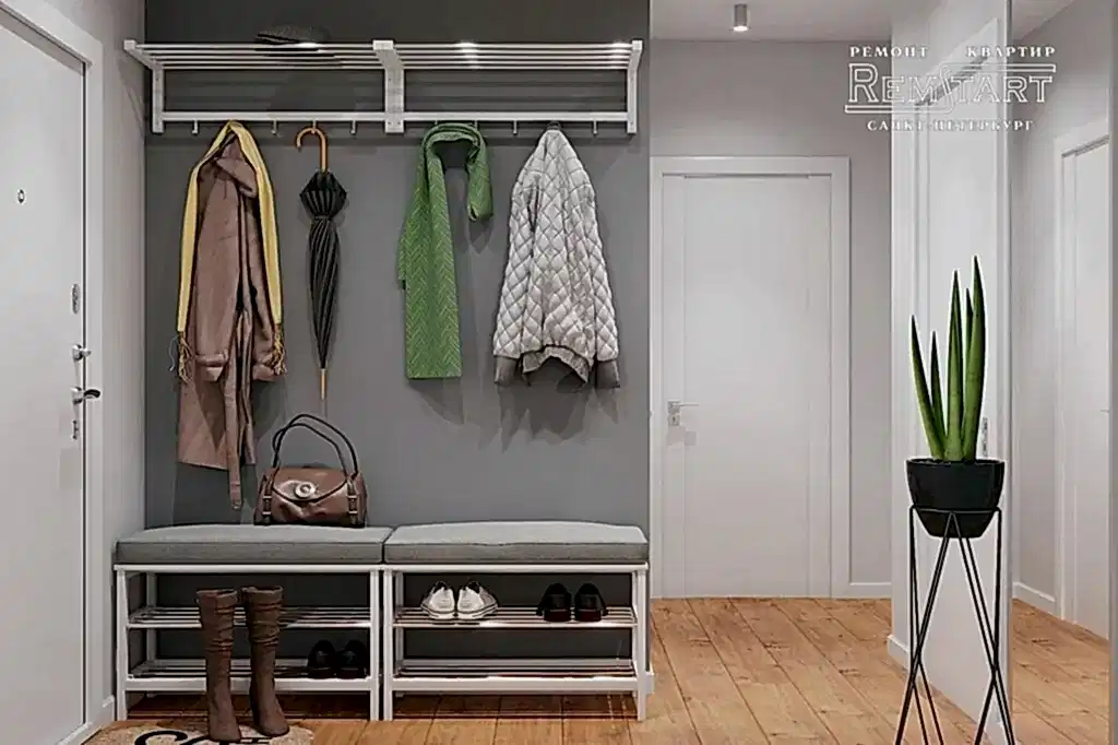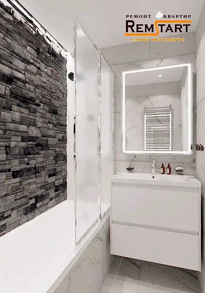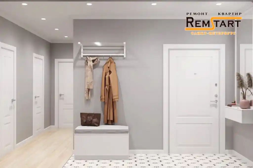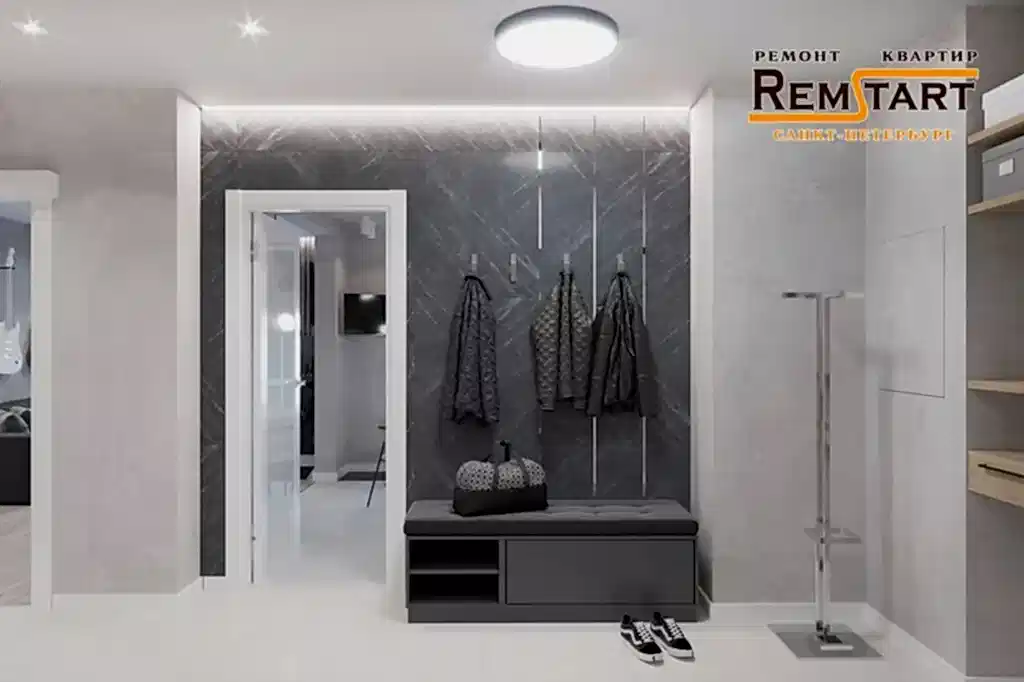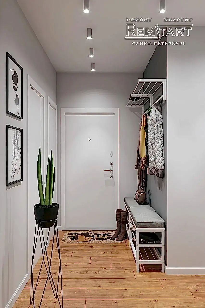 Красивый дизайн-проект двушки создан для отделки в светло-серых цветах Pin Up стилю с дополнением декоративным белым клинкерным кирпичом.