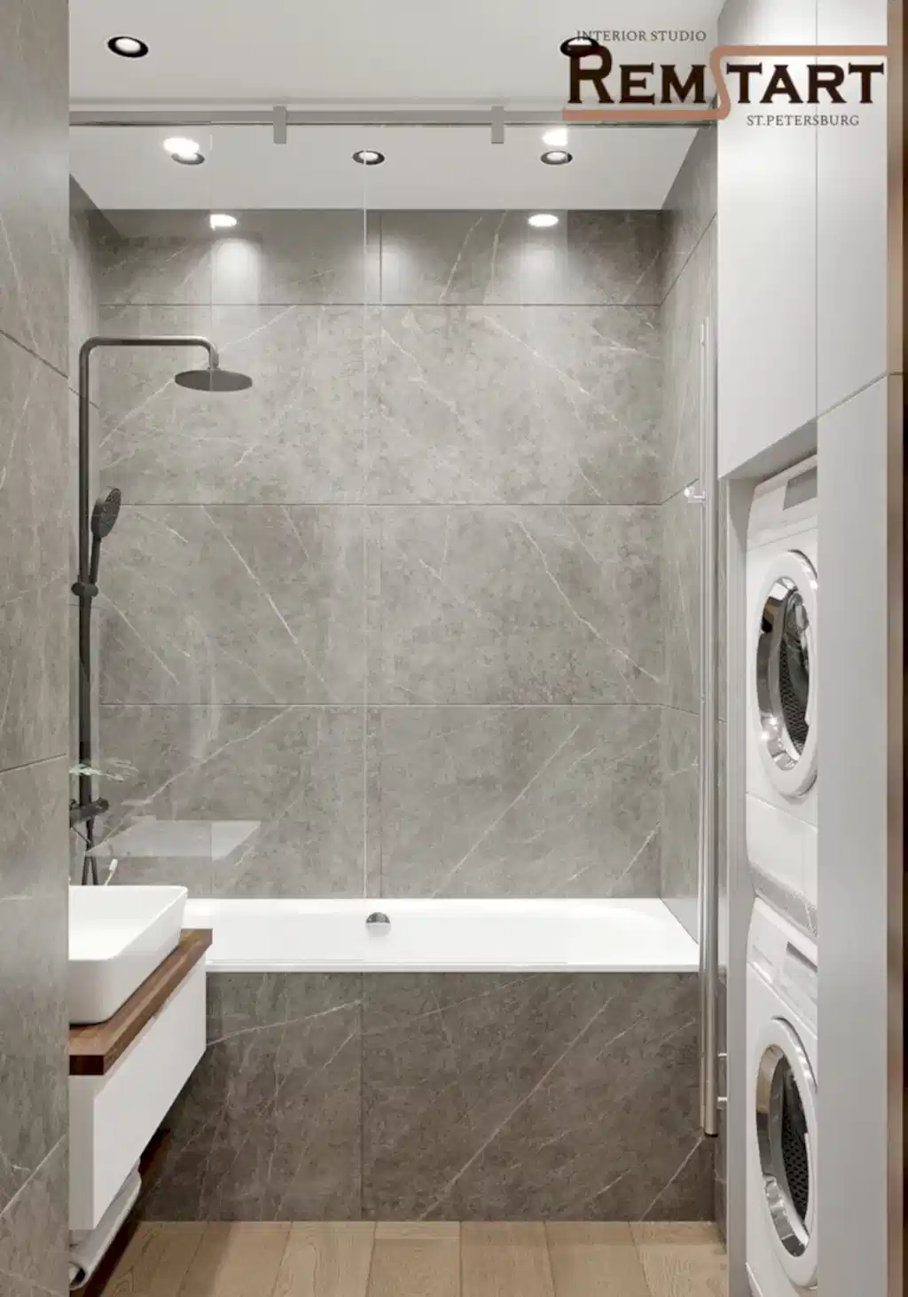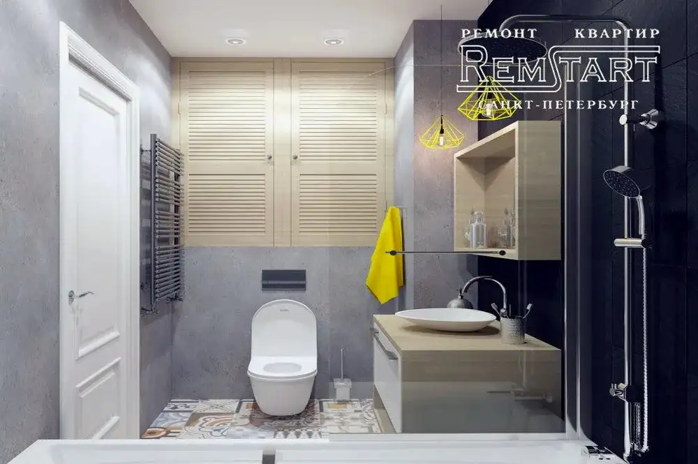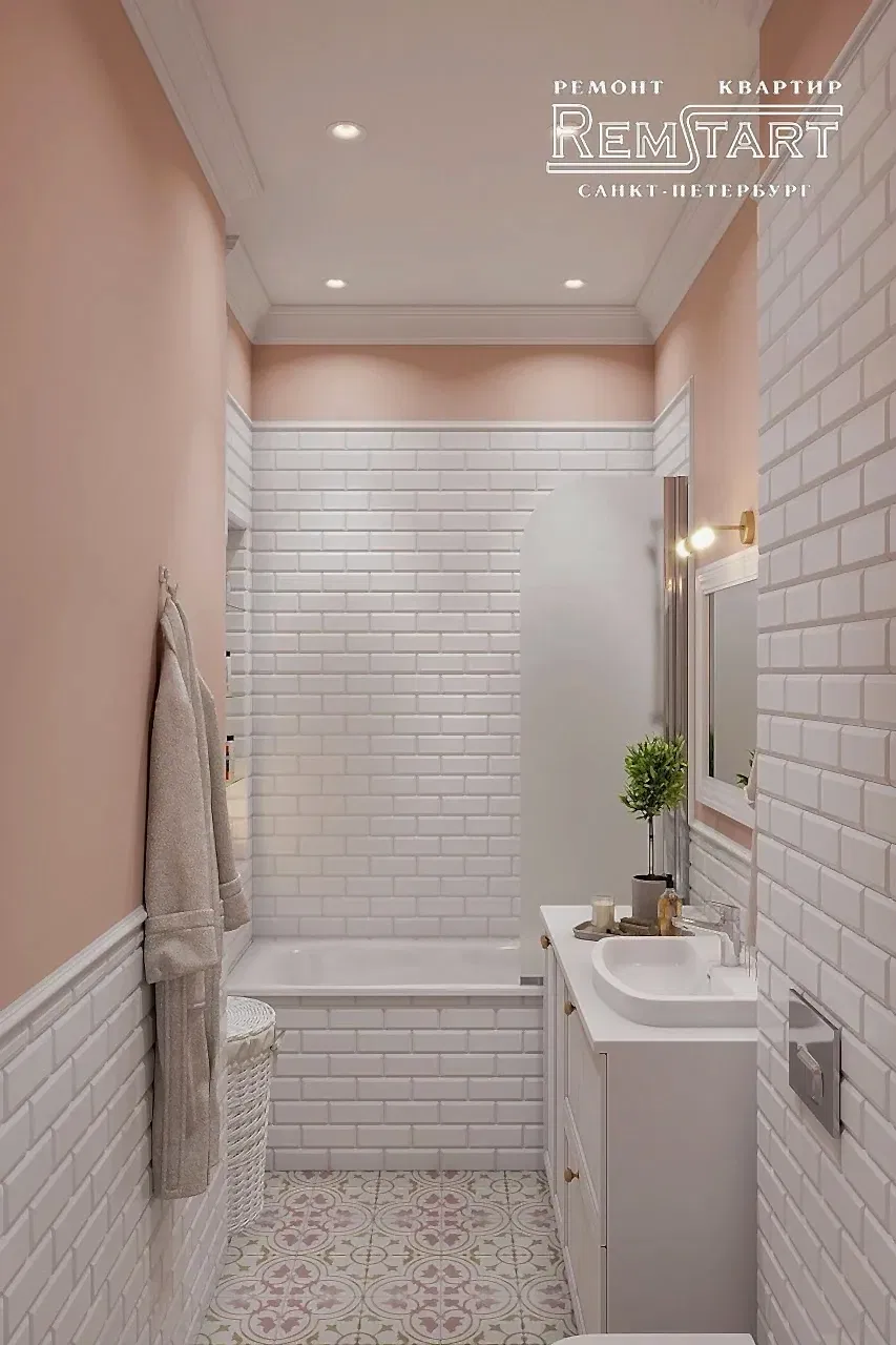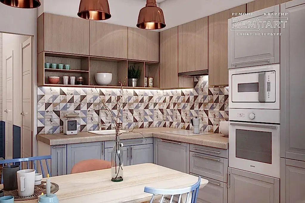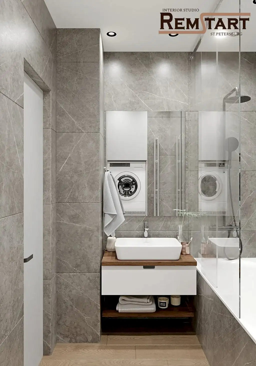 Красивый дизайн-проект двушки создан для отделки в светло-серых цветах Pin Up стилю с дополнением декоративным белым клинкерным кирпичом.