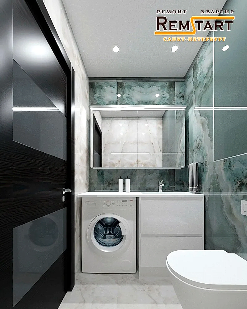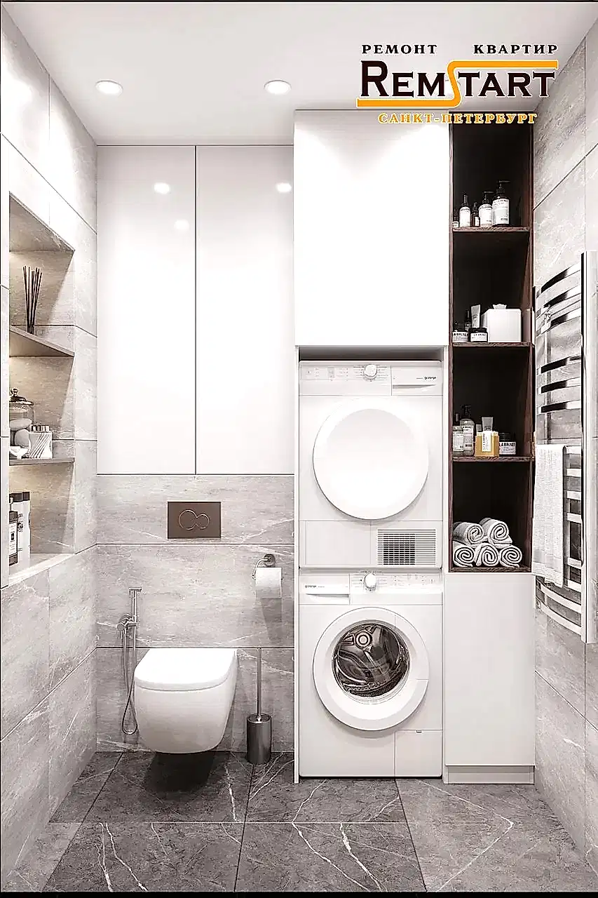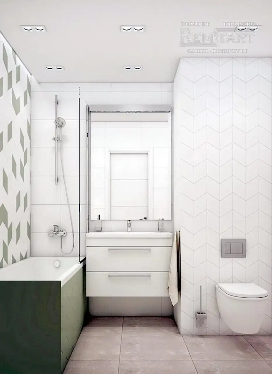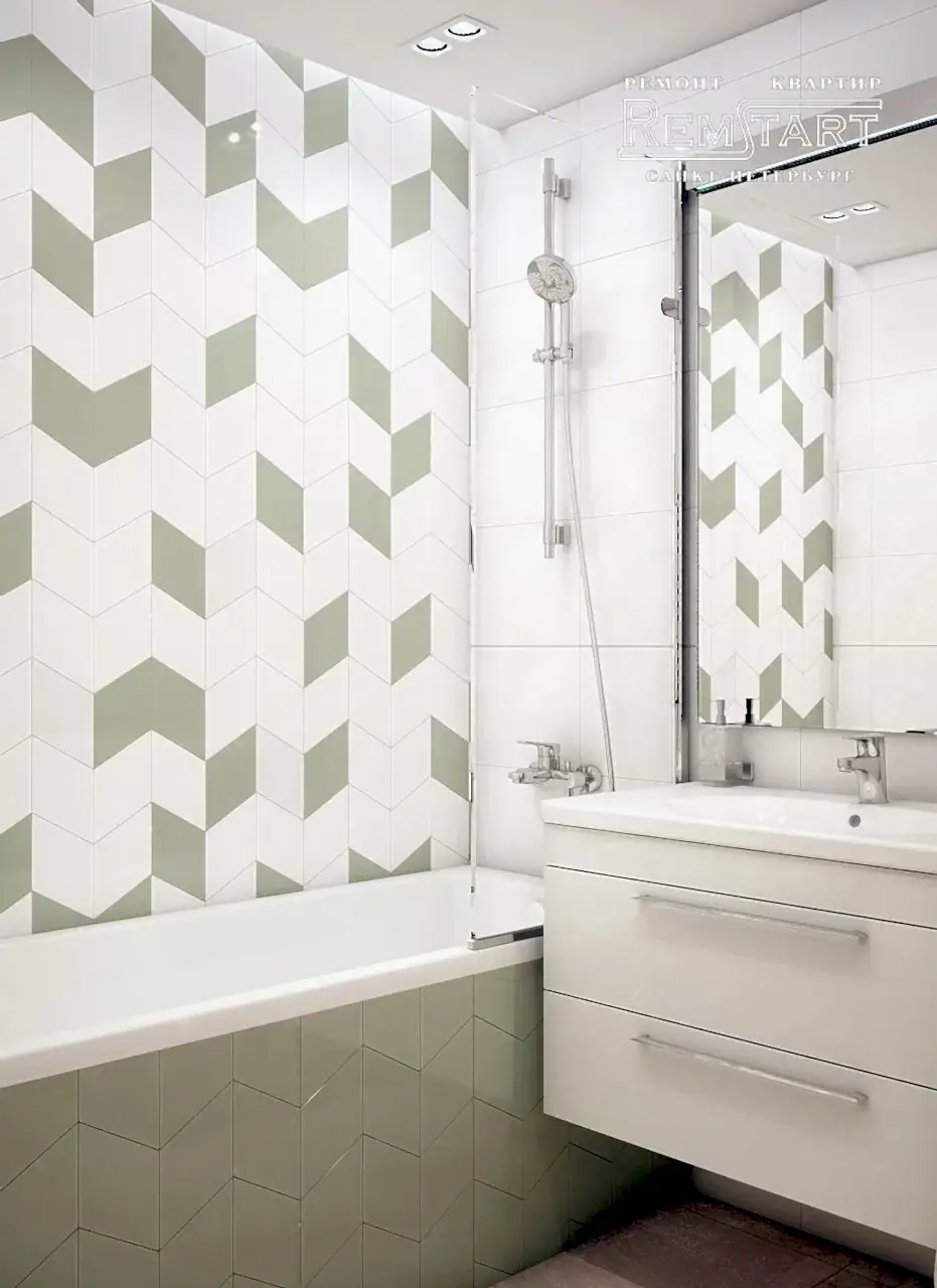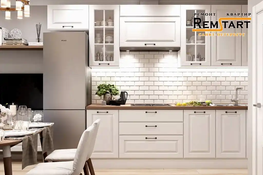 Красивый дизайн-проект двушки создан для отделки в светло-серых цветах Pin Up стилю с дополнением декоративным белым клинкерным кирпичом.