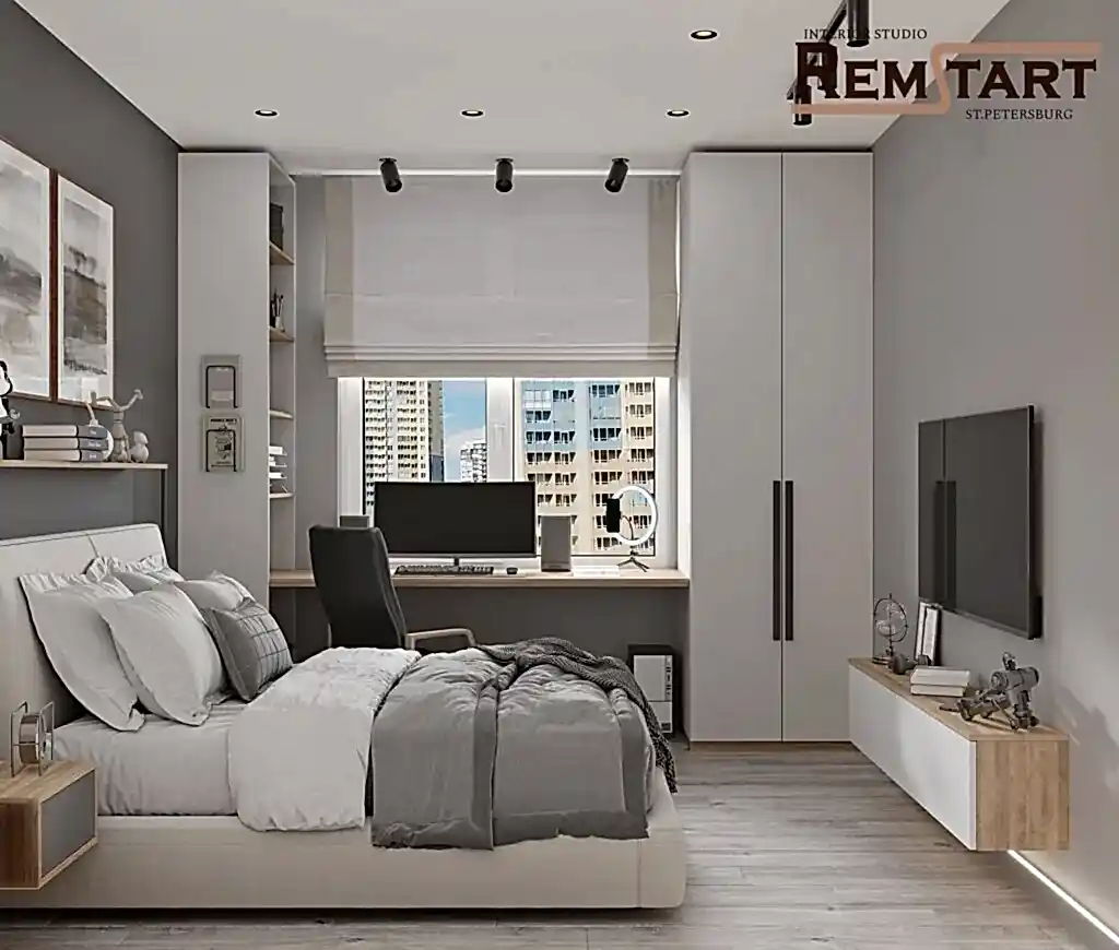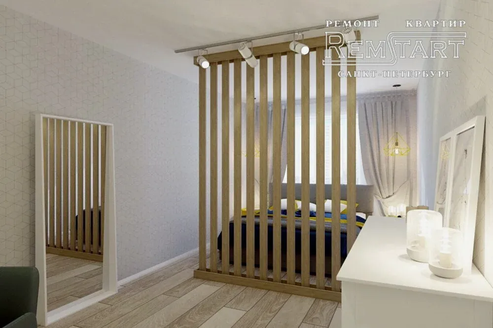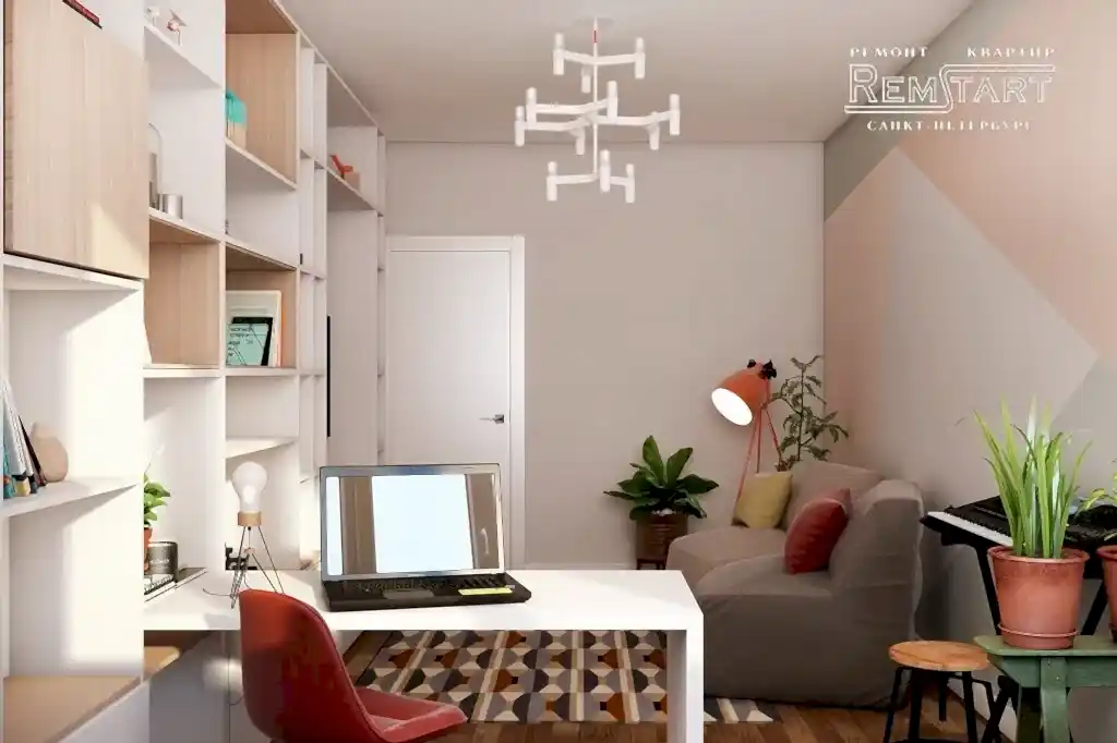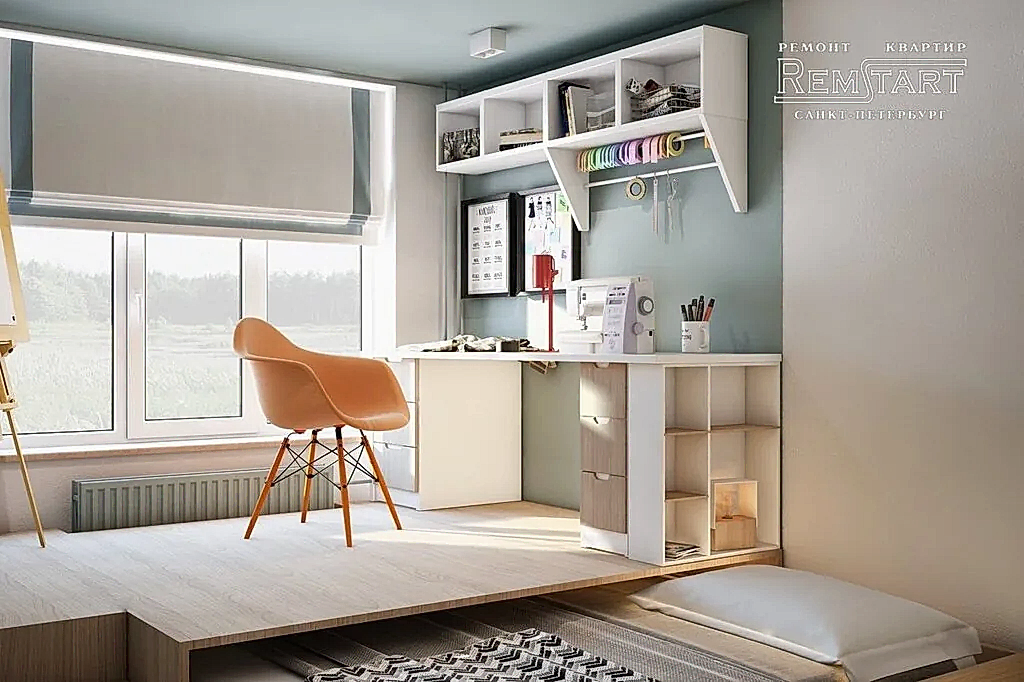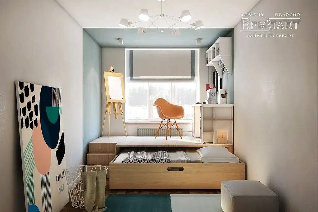 Распланированный скандинавский интерьер для девушки художницы с Pin Up и мольбертом.