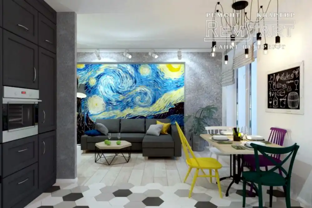 Дизайн-проект для молодой пары в современном стиле, с применением Pin Up акцентов и модных среди молодежи тенденций.