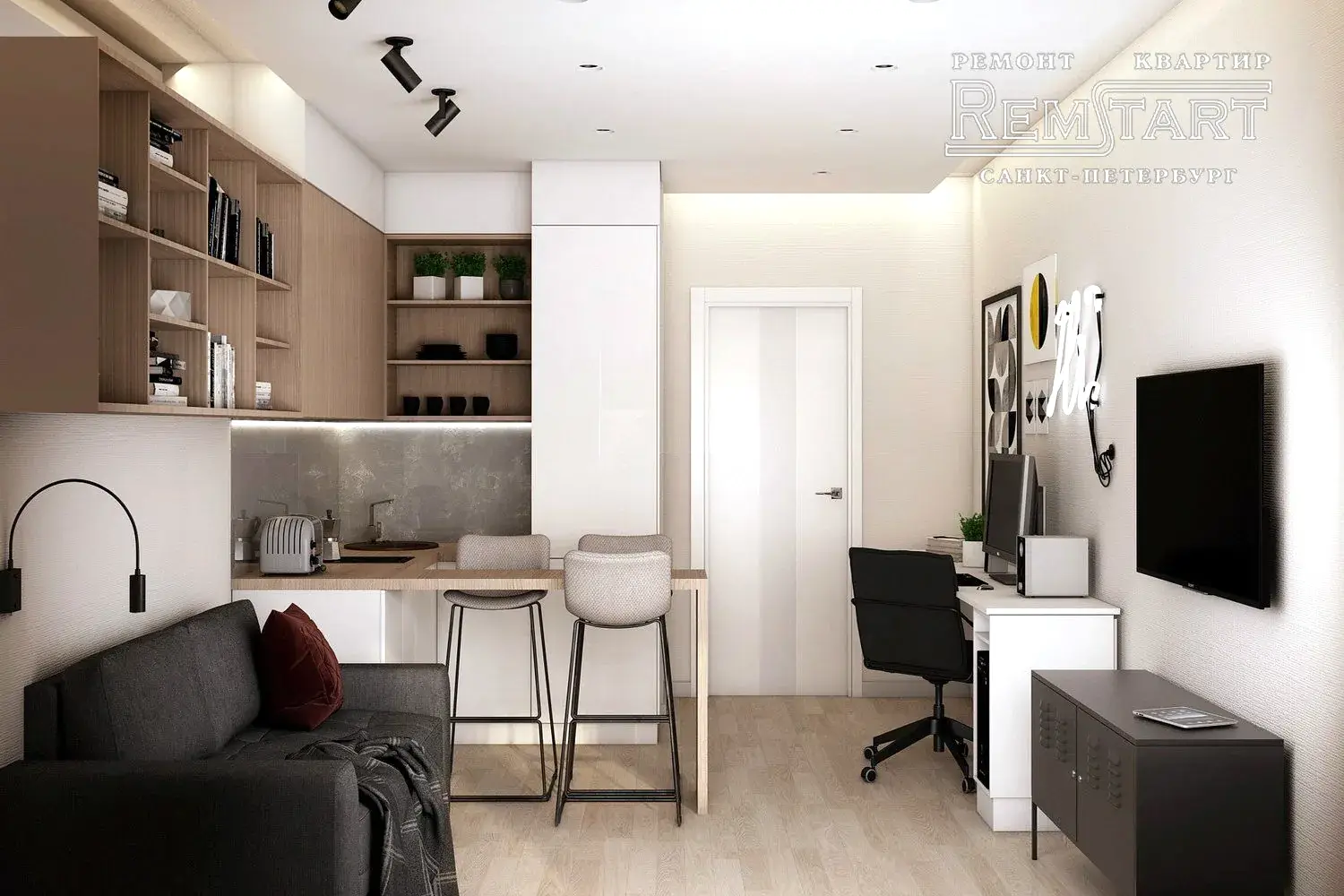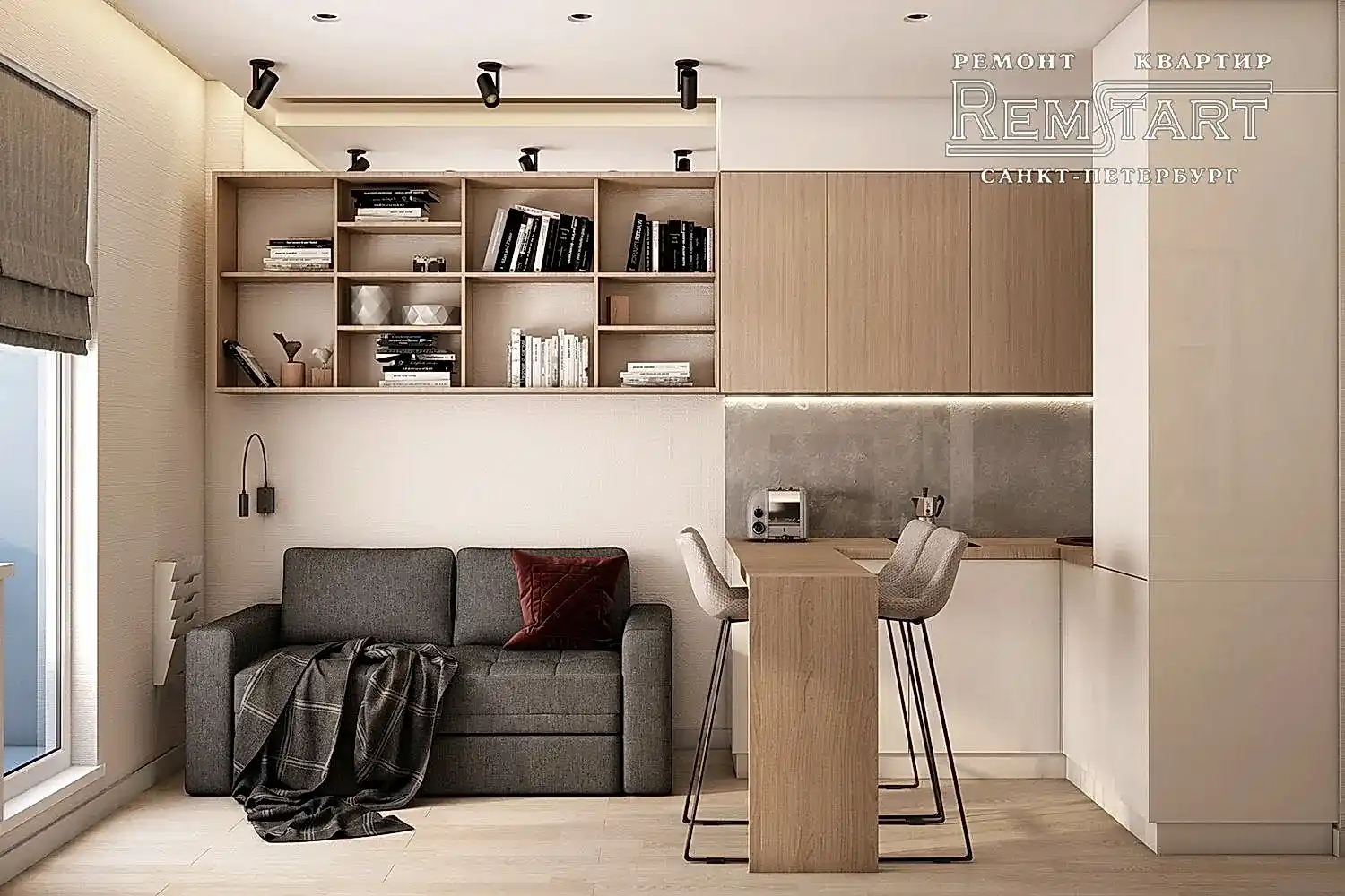 Предпочтение при оформлении дизайна интерьера отдалось светлой однотонной Pin Up и зонированию.