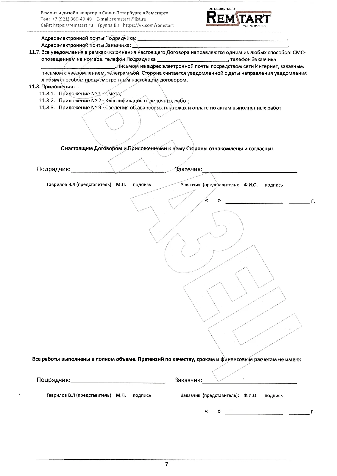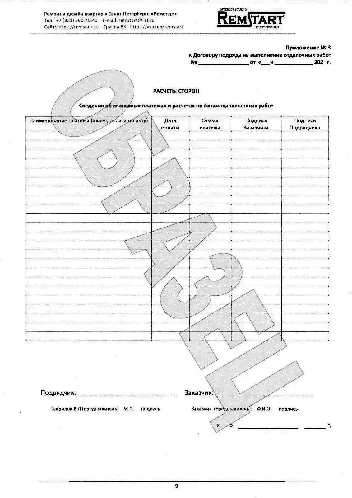 К договору прилагается подробнаясмета отделочных работ, зафиксирована цена услуг, сроки проведения Pin Up и расчеты между Сторонами.