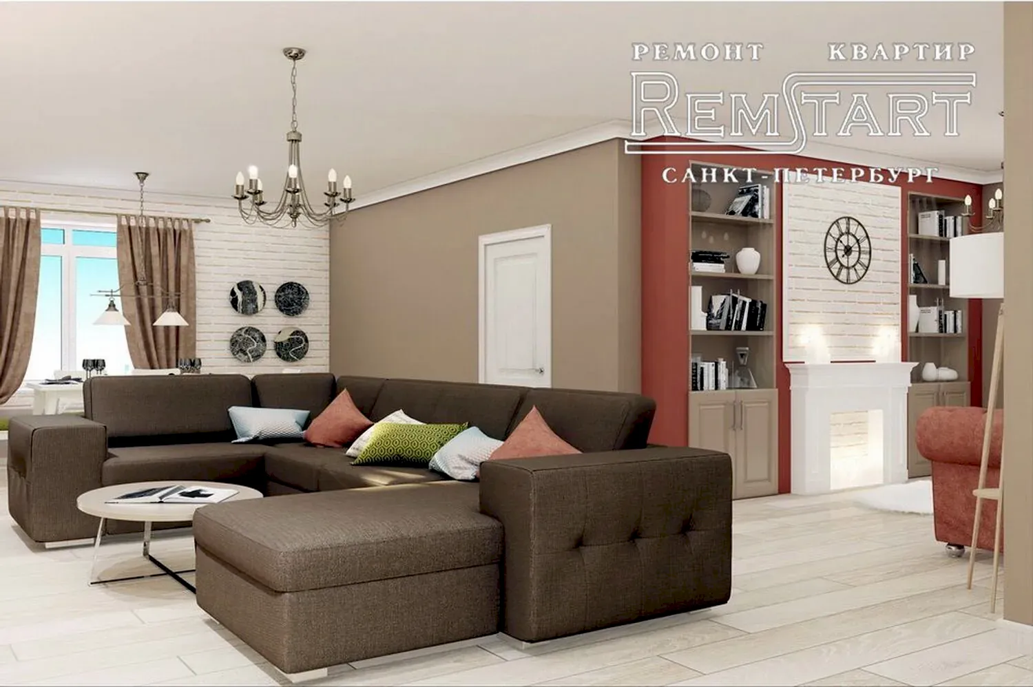 Для отделки поверхностей использованы приятные оттенки, которые сочетаются Pin Up с другом, а изюминкой интерьера большой гостиной - стал портал в виде камина.