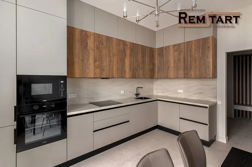 Ремонт двухкомнатной квартиры с перепланировкой в новом доме реализован с совмещением кухни и лоджии. Применены стандартные Pin Up