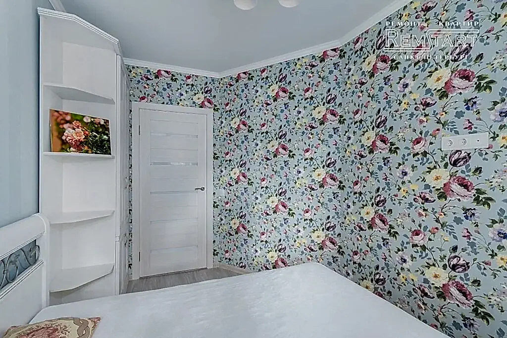 Бюджетный ремонт 2 комн. квартиры выполнен в новостройке с Pin Up выравниванием стен, обоями и натяжными потолками.