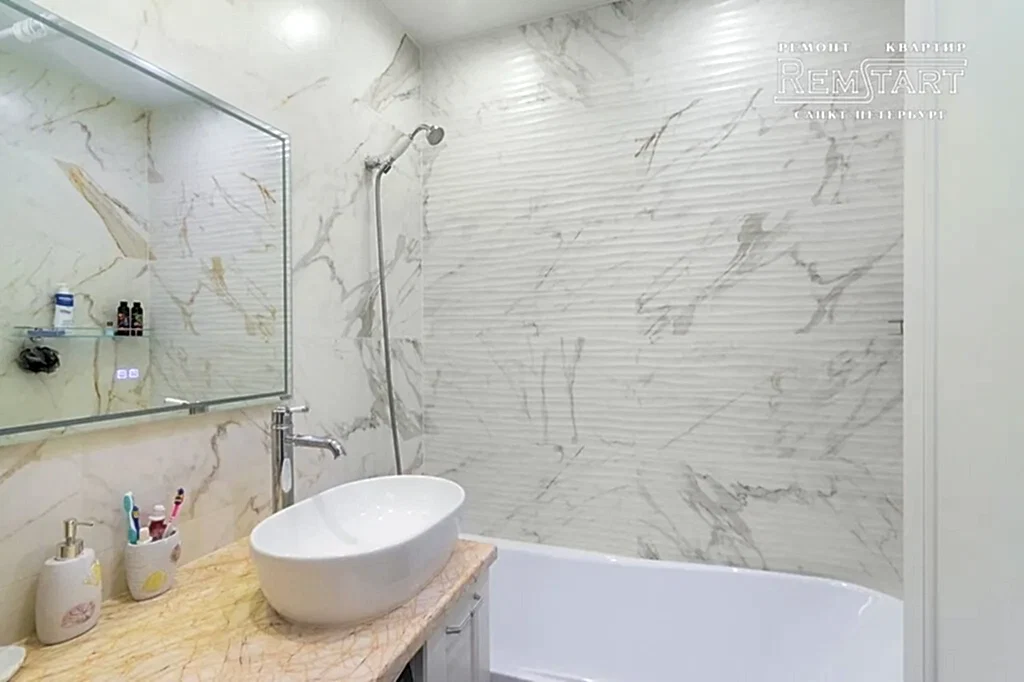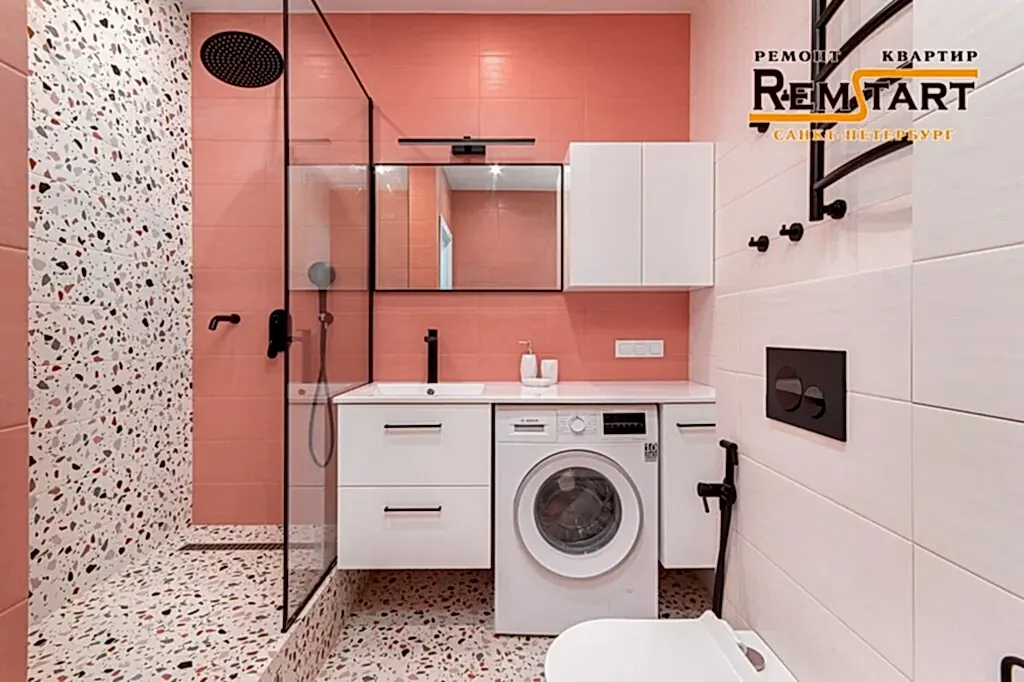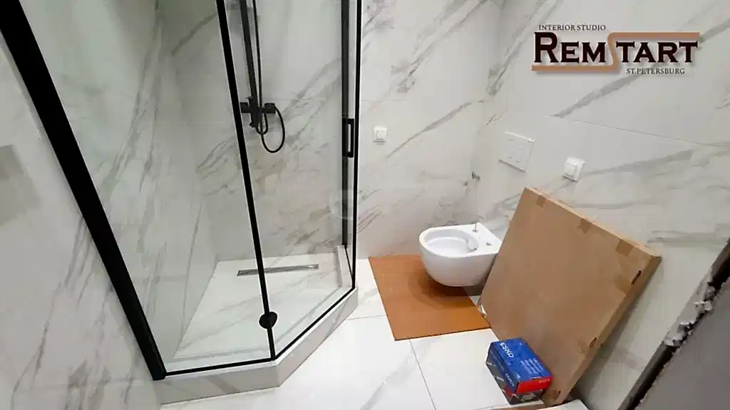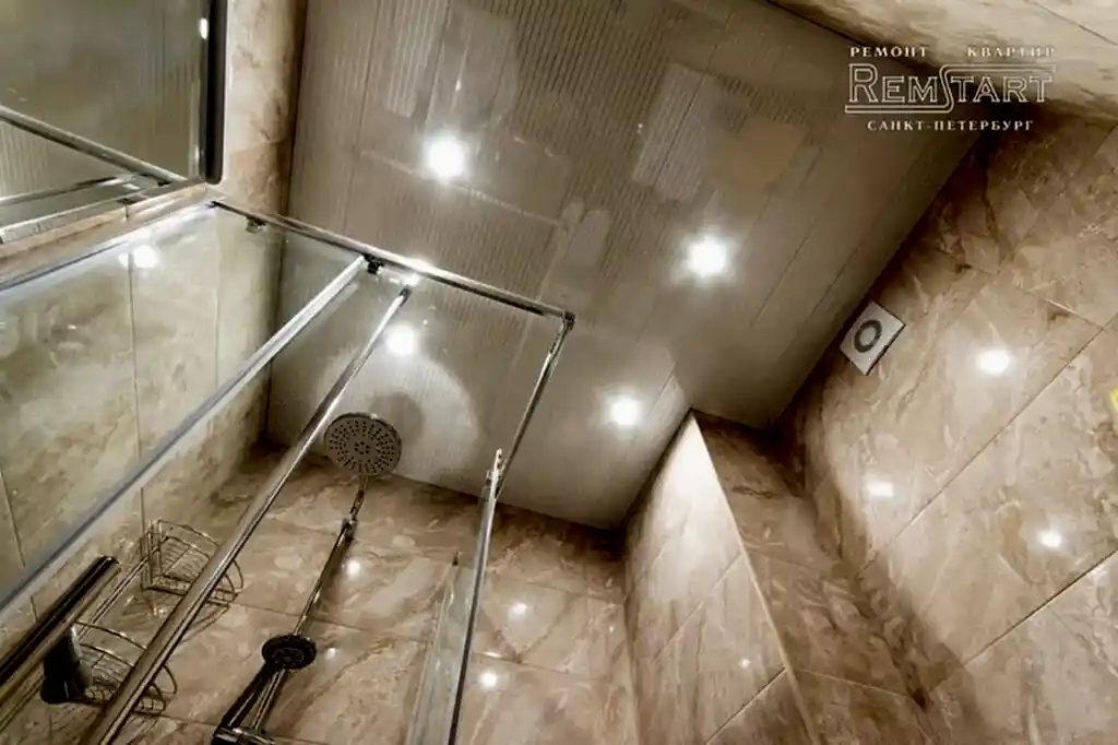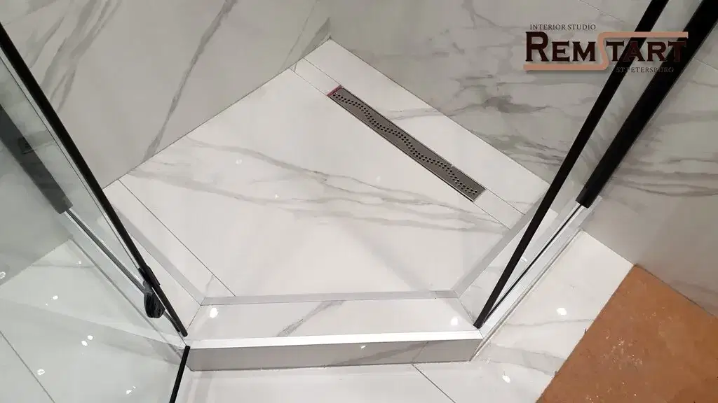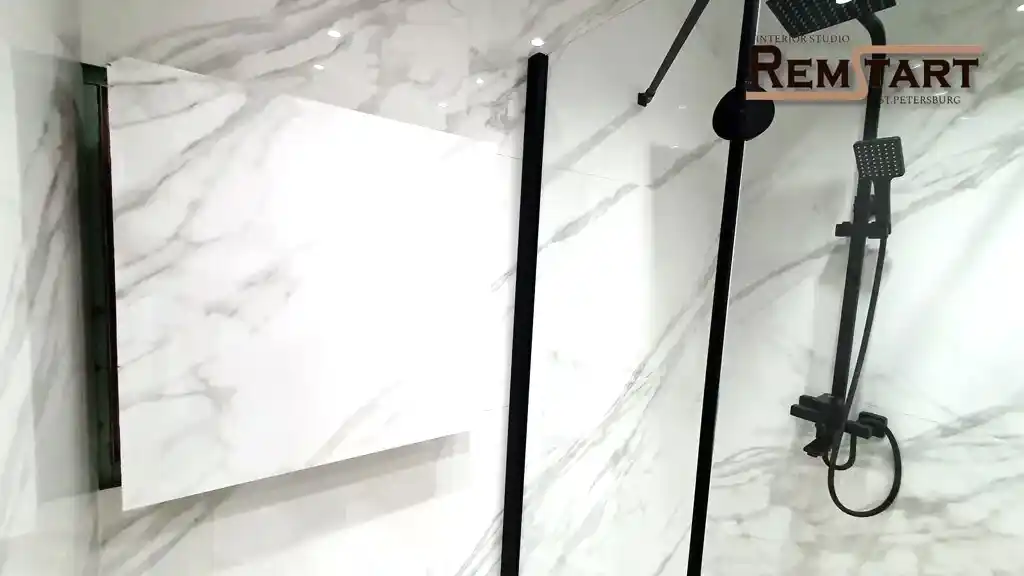 На финальной стадии устанавливается скрытая инсталляция, накладные раковины и смесители. Возможно изготовление душевого поддона со Pin Up шторами.