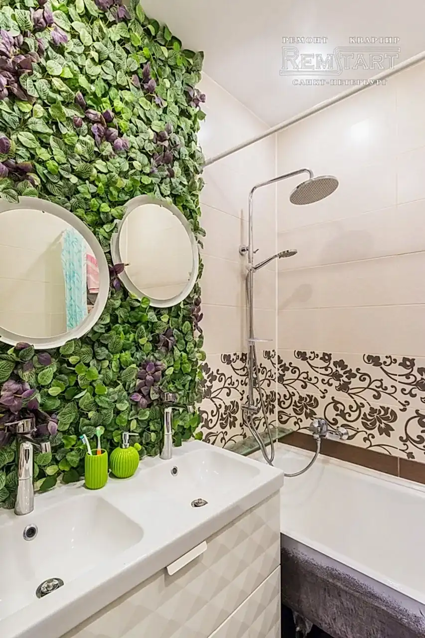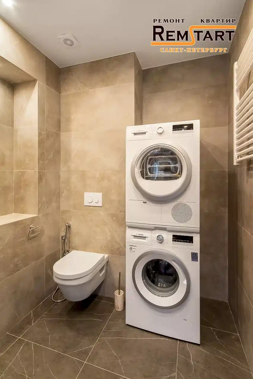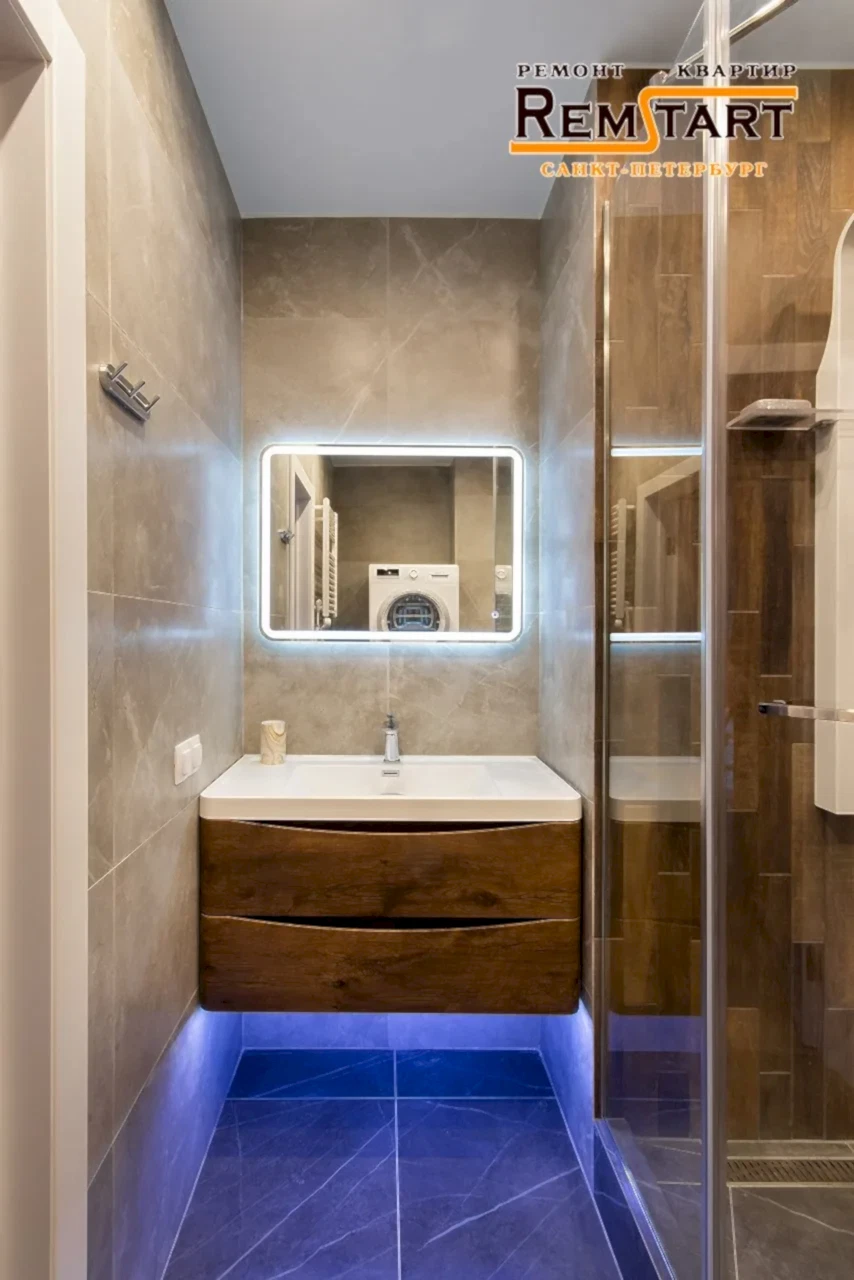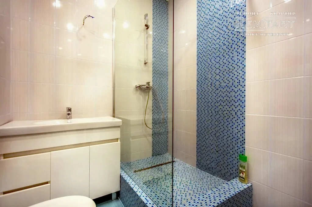 На финальной стадии устанавливается скрытая инсталляция, накладные раковины и смесители. Возможно изготовление душевого поддона со Pin Up шторами.