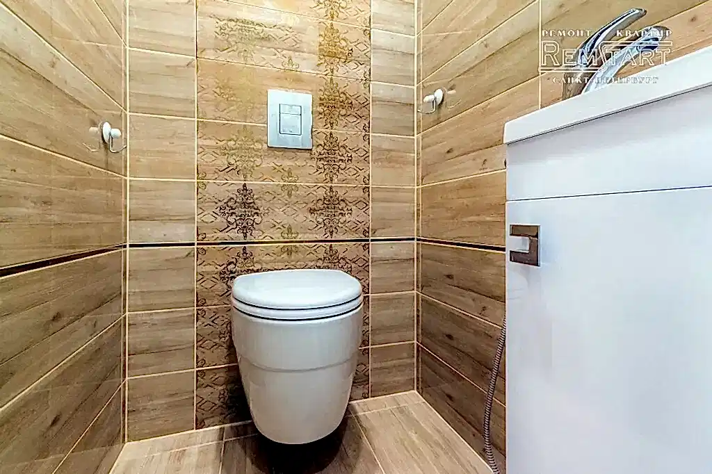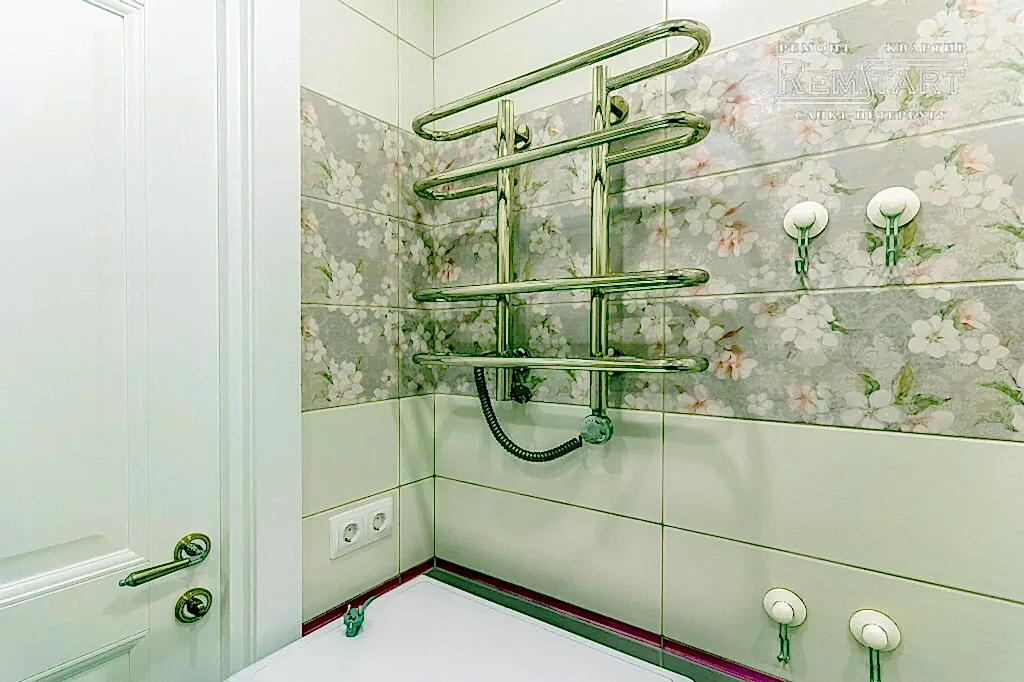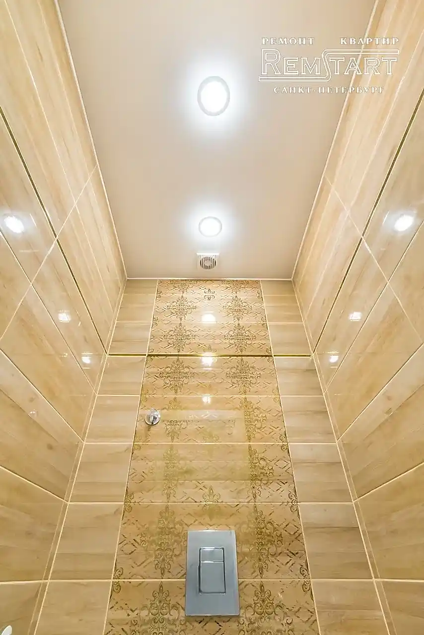 В ванной комнате уложен керамогранит и система Pin Up пола. Установлена скрытая инсталляция, акриловая ванная и водонагреватель.