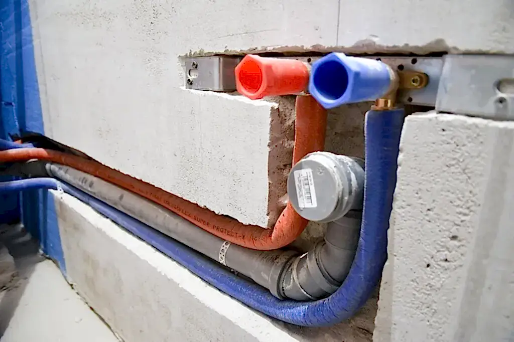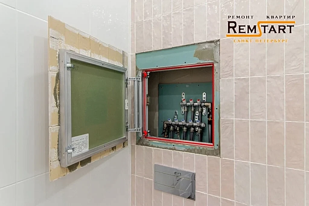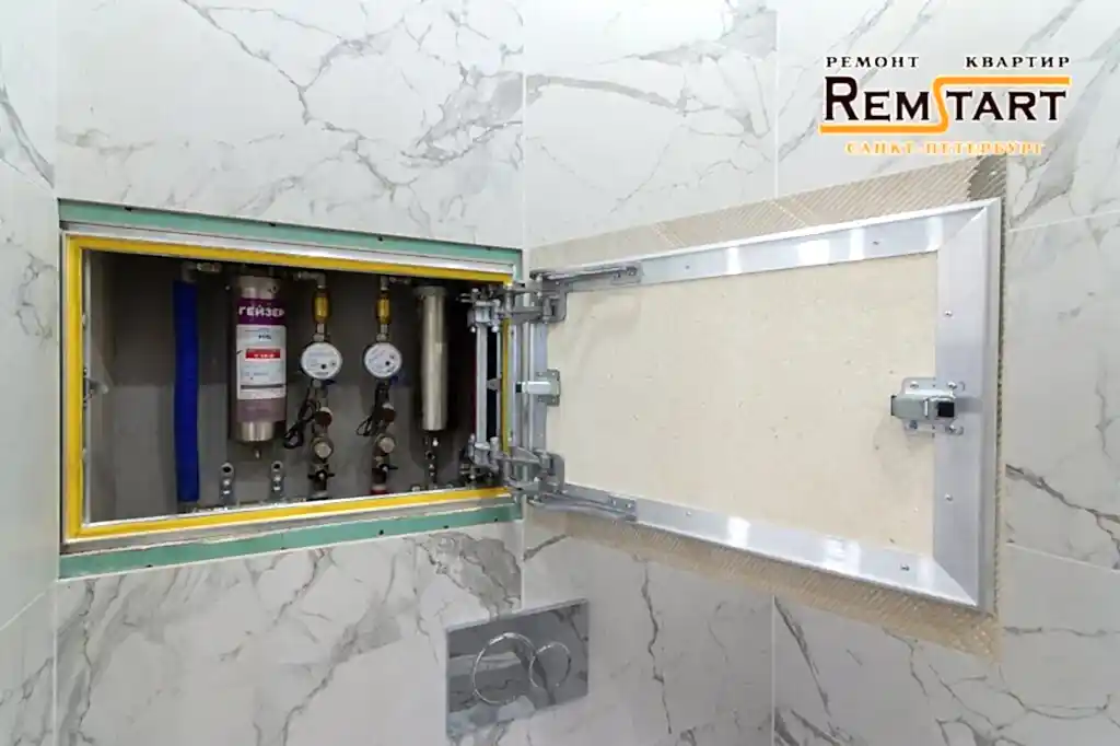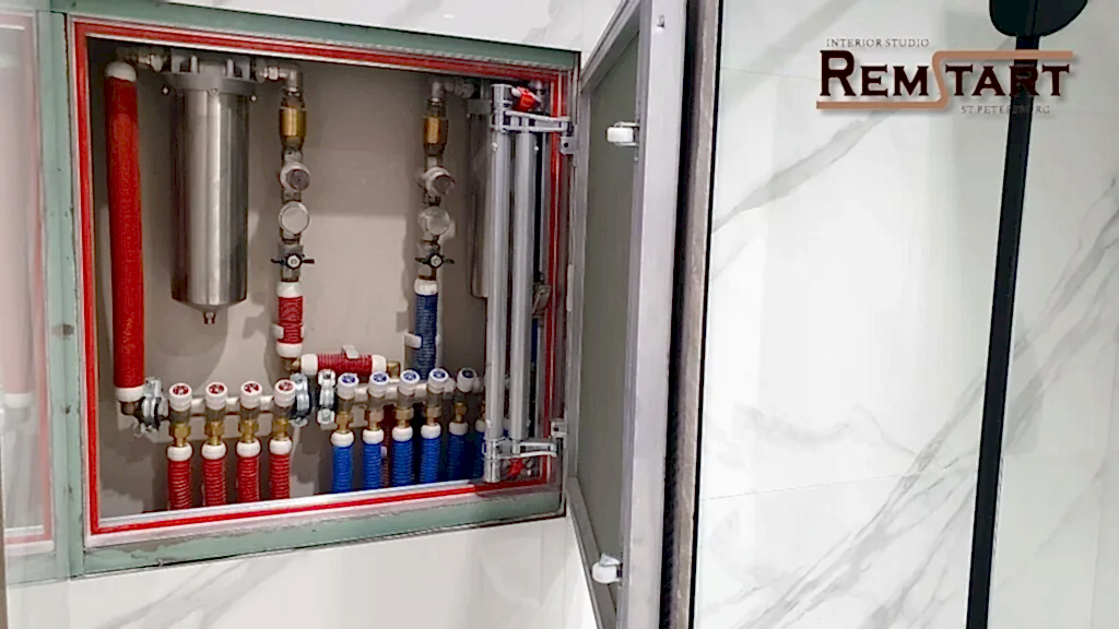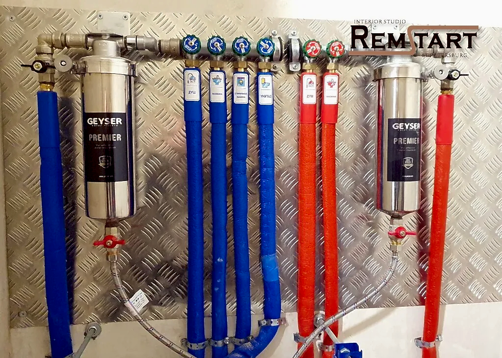 Выполняется коллекторная система водопровода, с фильтрами грубой очистки. Трубы водопровода прячутся в стены. Возможна замена и перенос Pin Up и радиаторов отопления.