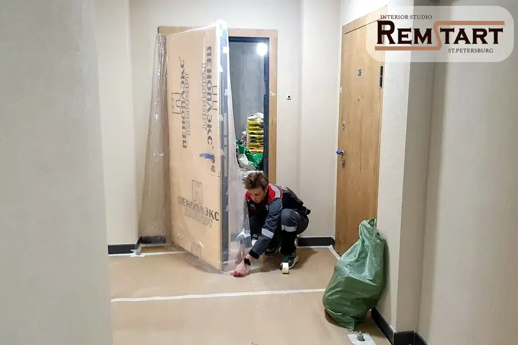 Обязательно нужно обезопасить входную дверь, радиаторы отопления демонтировать или Pin Up пленкой.