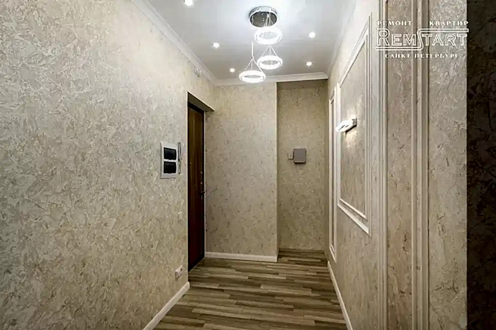 Отделка трешки сделана по Pin Up ценовой категории, так как декоративную штукатурку заменили фактурные обои и это значительно удешевило стоимость работ.