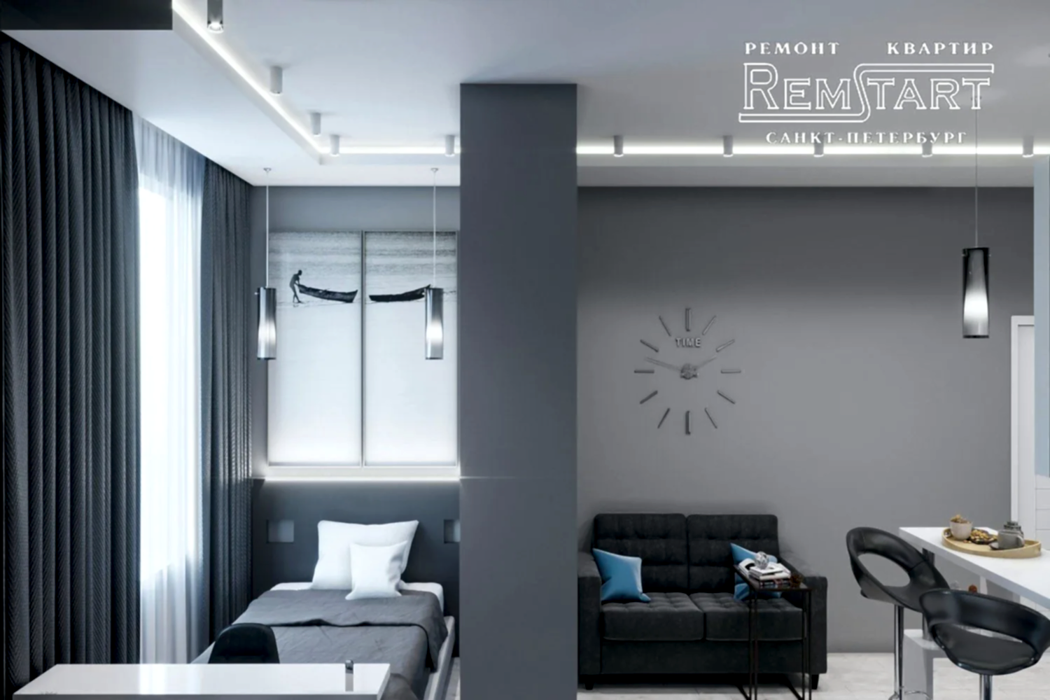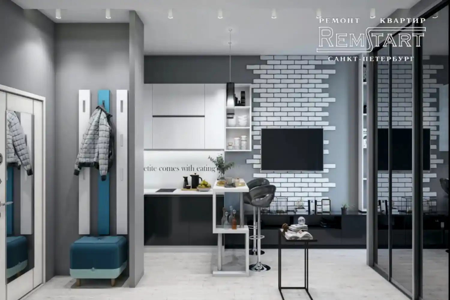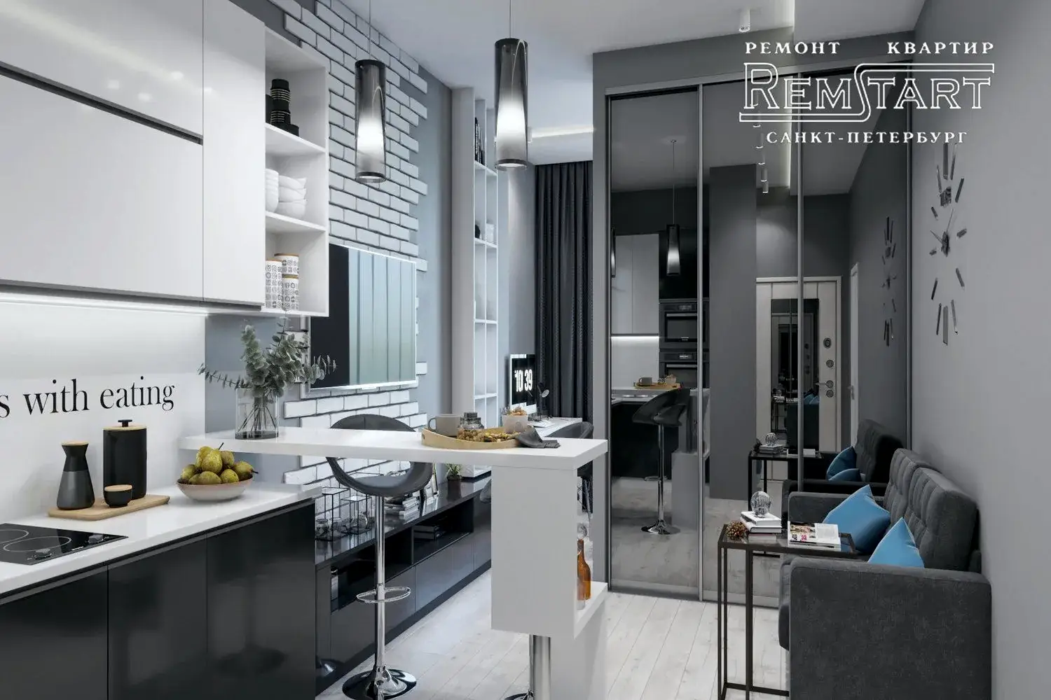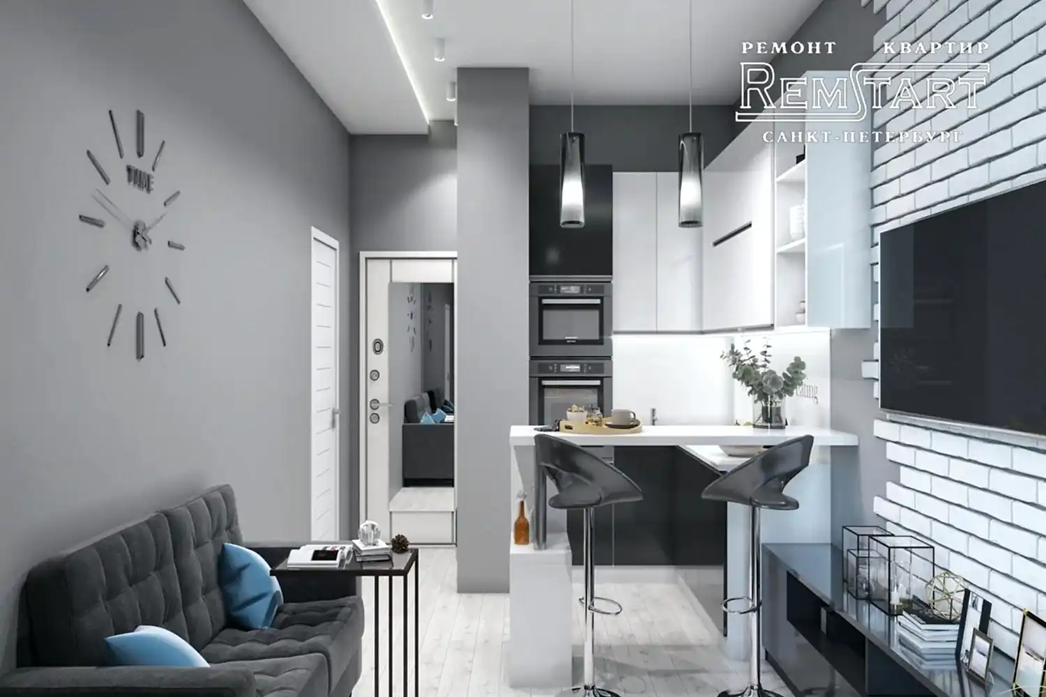 Приоритетом оформления стали: серый цвет стен, декоративный камень и сложная система закарнизной подсветки. Контраста придала Pin Up белая мебель и клинкерный кирпич.