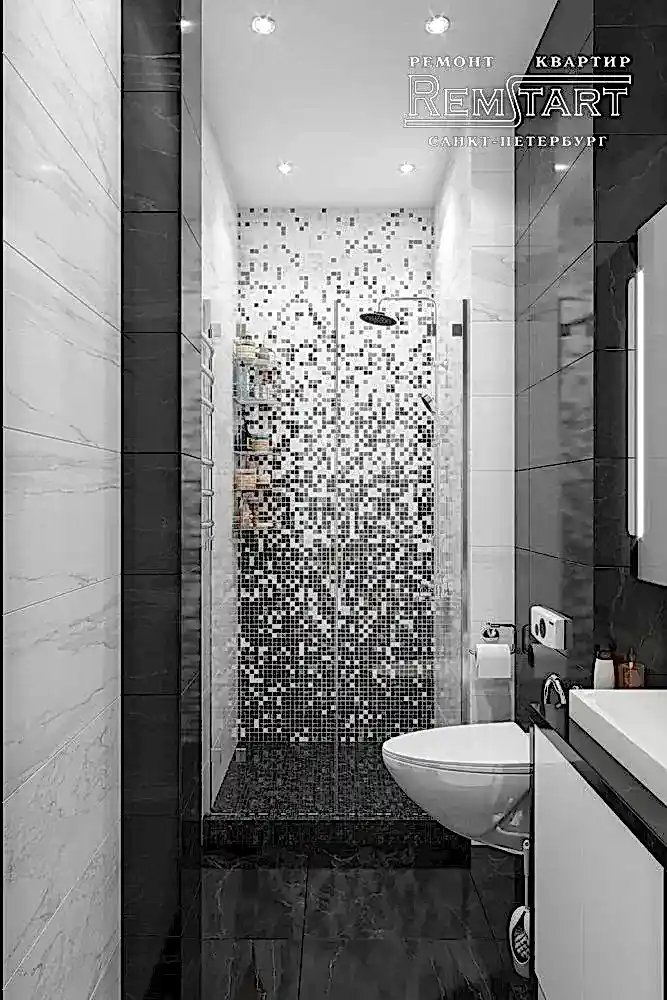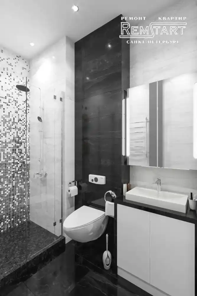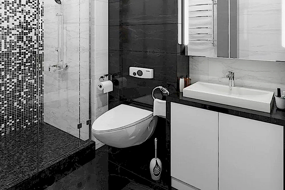 Ванная комната оформлена коллекционным кафелем «под мрамор» и мозаикой черно-белого цвета.