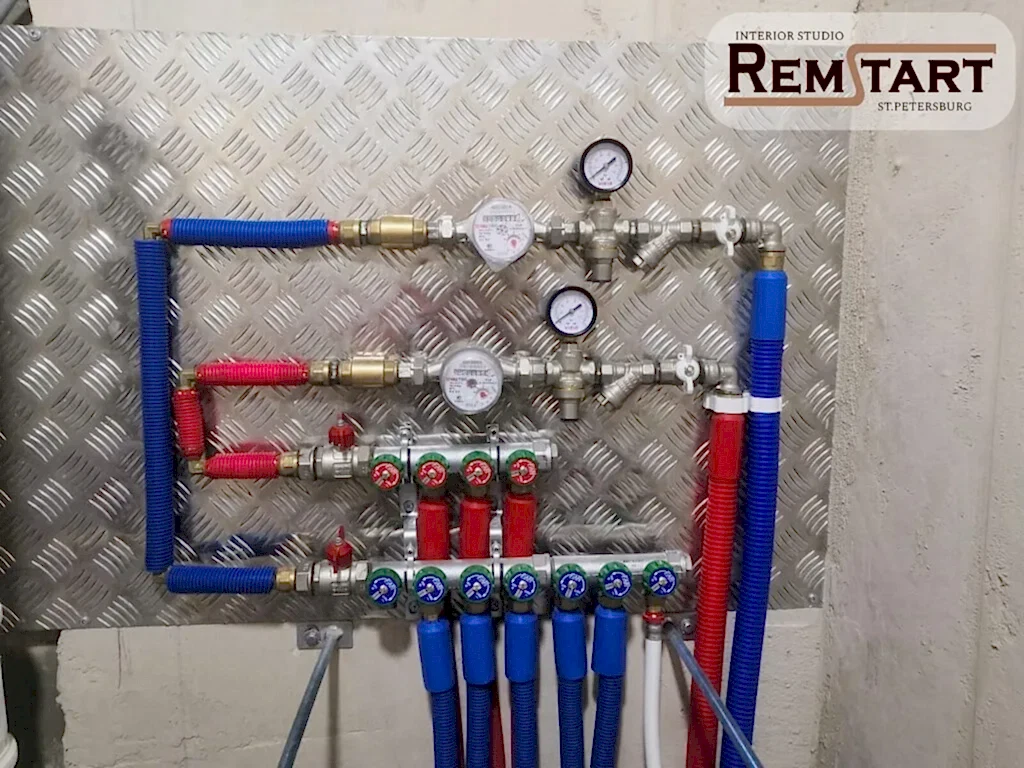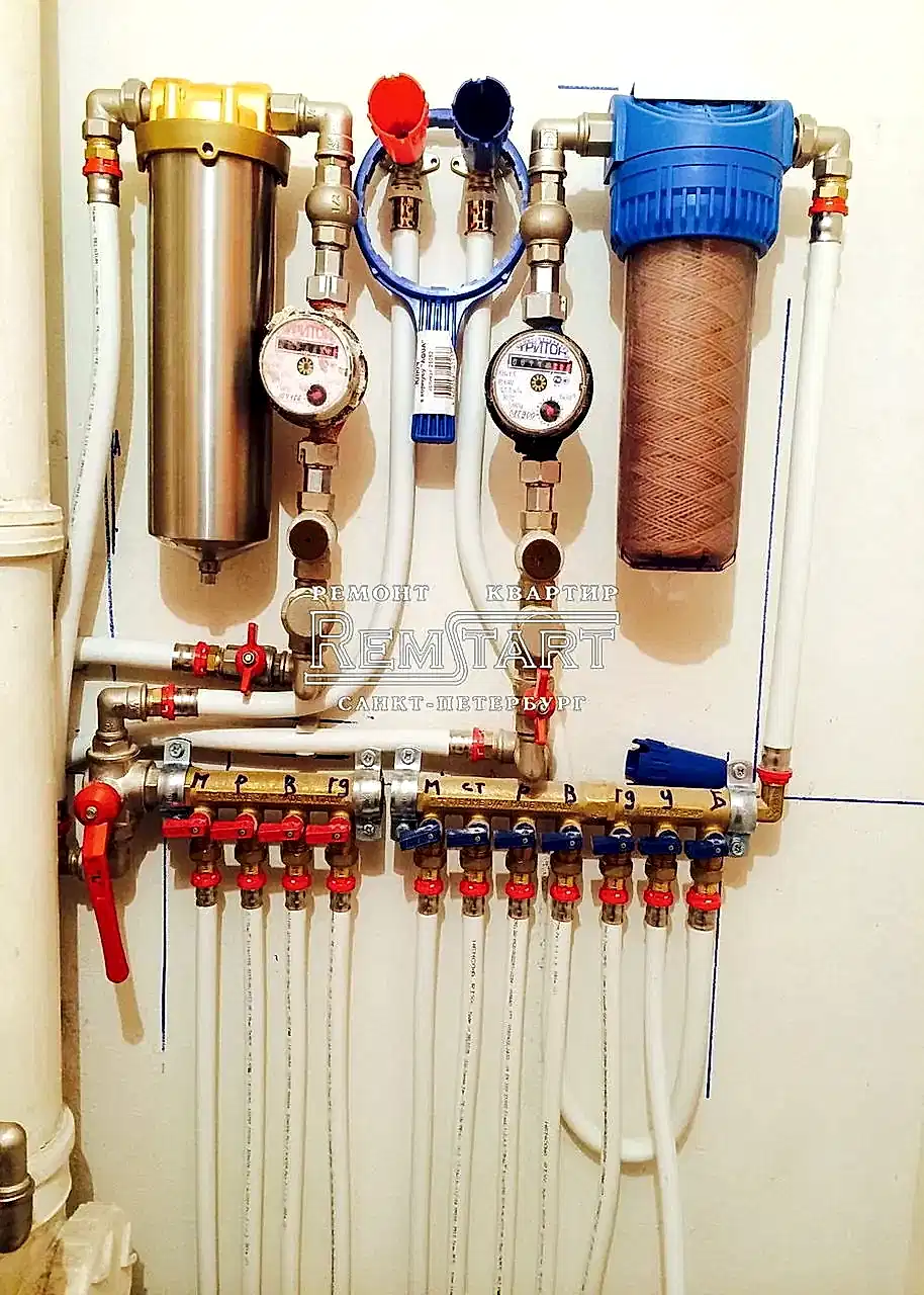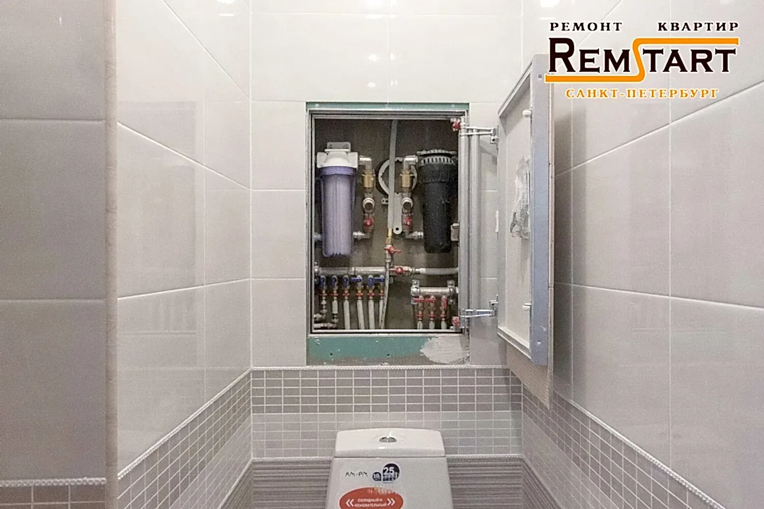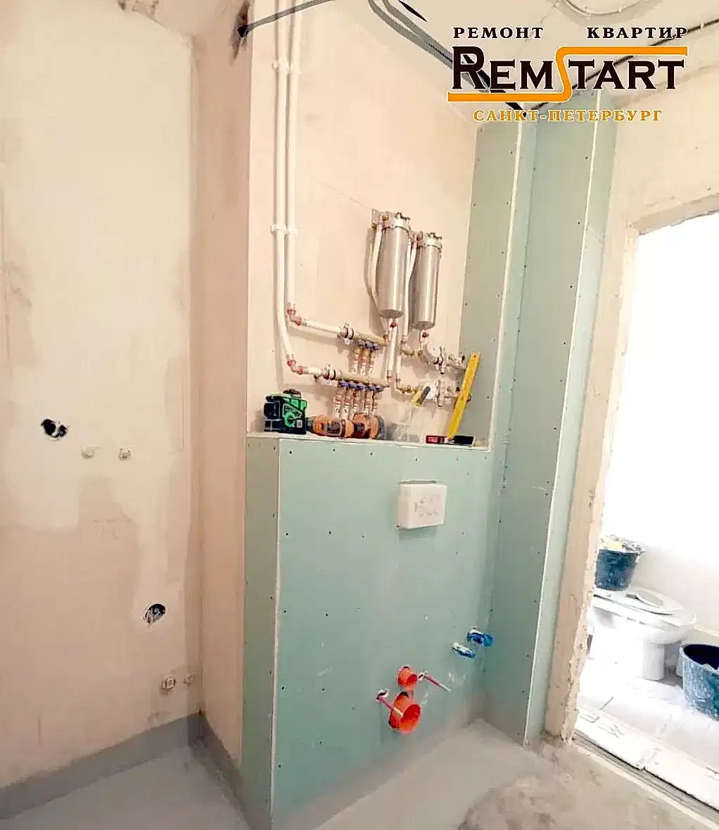 Выбор большинства заказчиков приремонте квартир в новостройках. Трубы прячутся в стены, устанавливают коллектора, редукторы давления, переносятся счетчики Pin Up