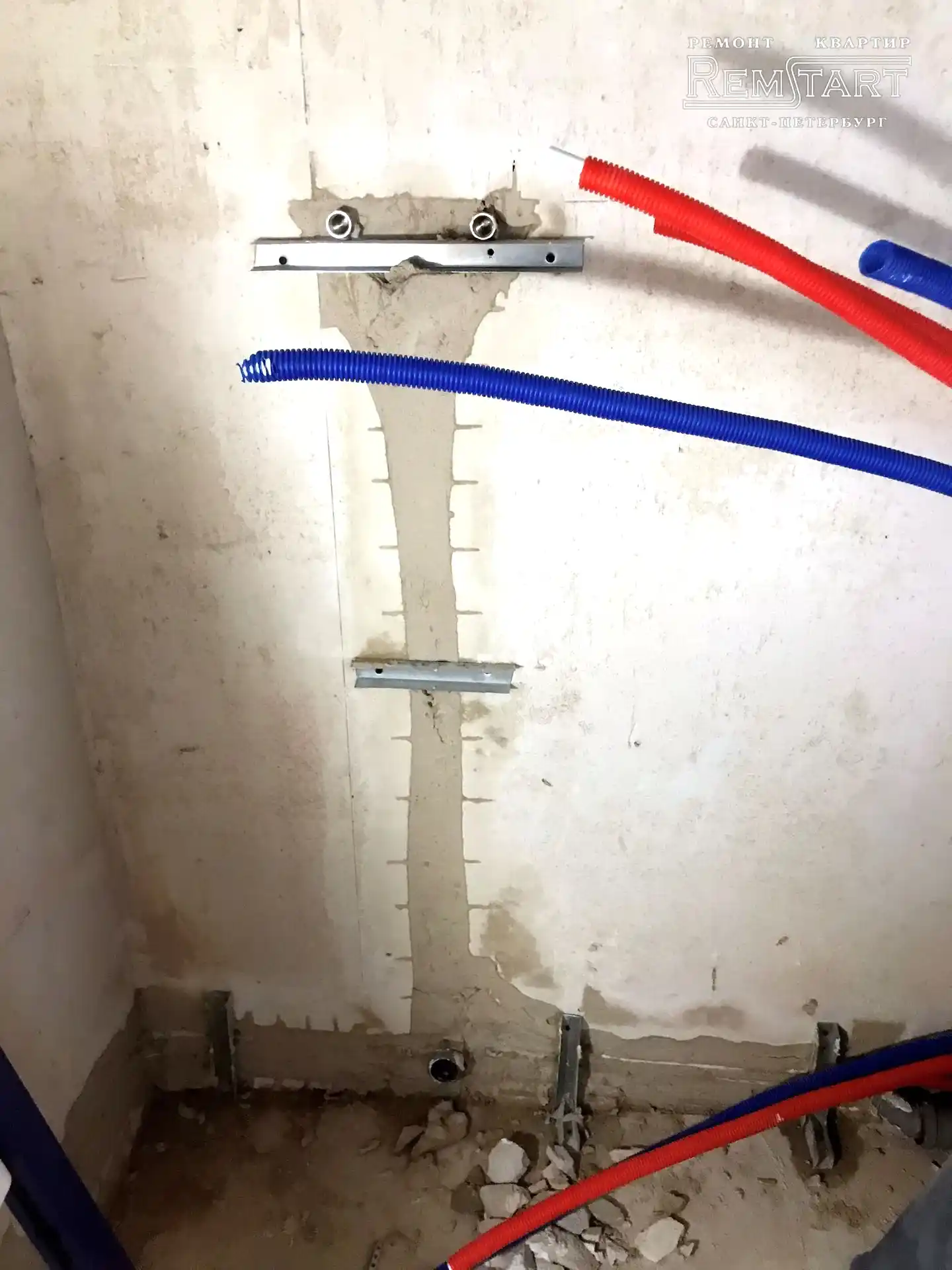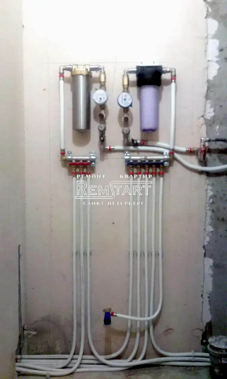 Недорогой вариант разводки Pin Up водопровода в новостройках. Штробление стен сводится к минимуму, не устанавливаются фильтры очистки и манометры давления.