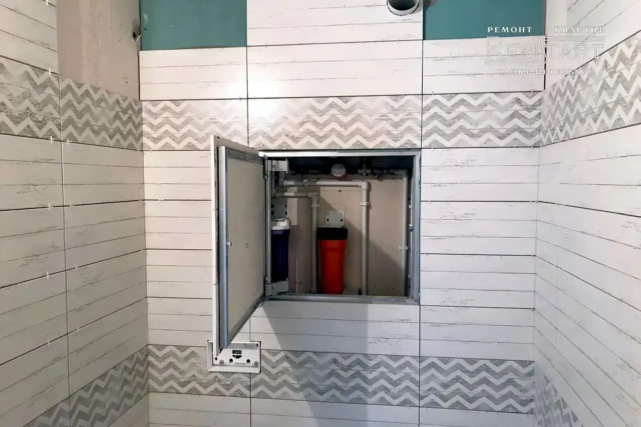 Наиболее частое решение для доступа к счетчикам и инженерной системе водопровода является Pin Up поворотно откидной люк который облицовывается кафелем и имеет красивый внешний вид.