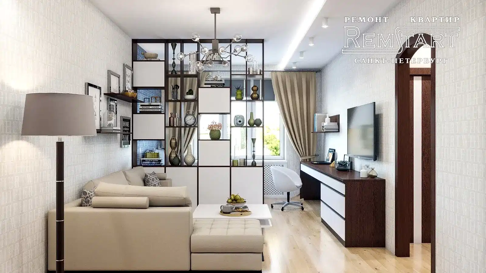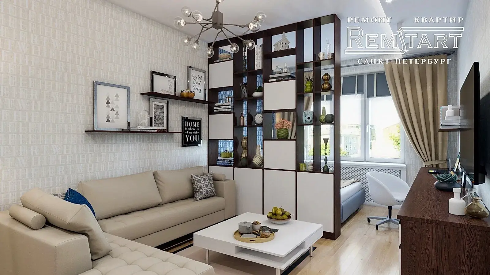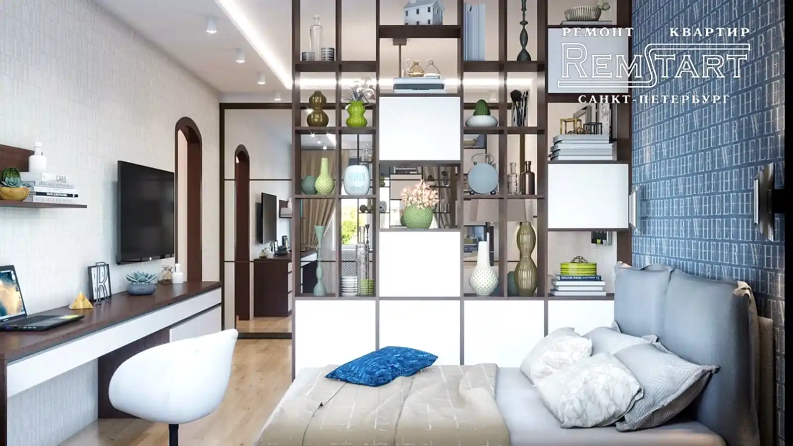 Просторная комната разделена с помощью высокого стеллажа с полками. На них установлены декоративные элементы, Pin Up идеально вписываются в современный классический стиль.