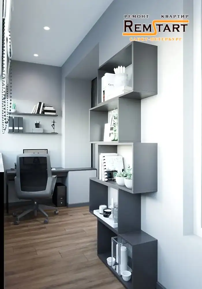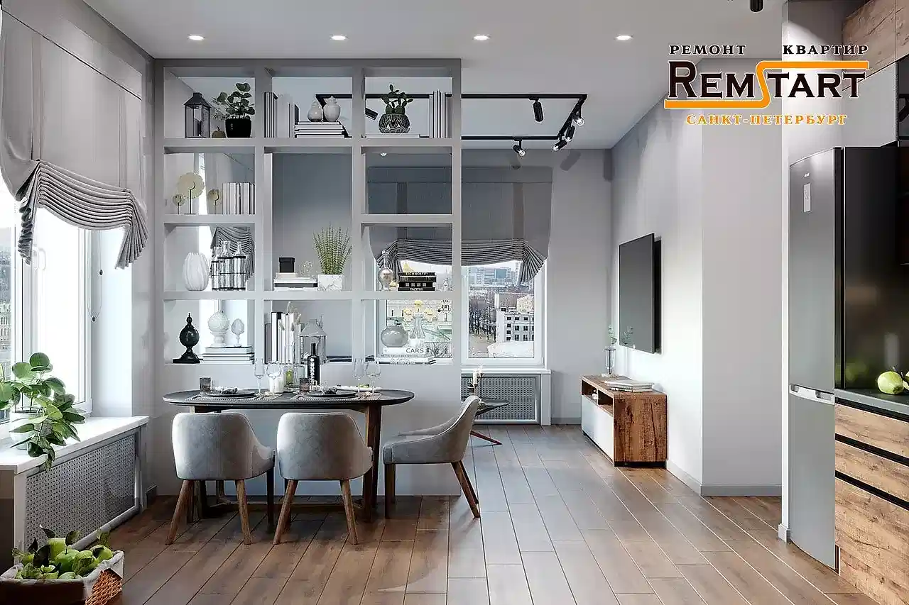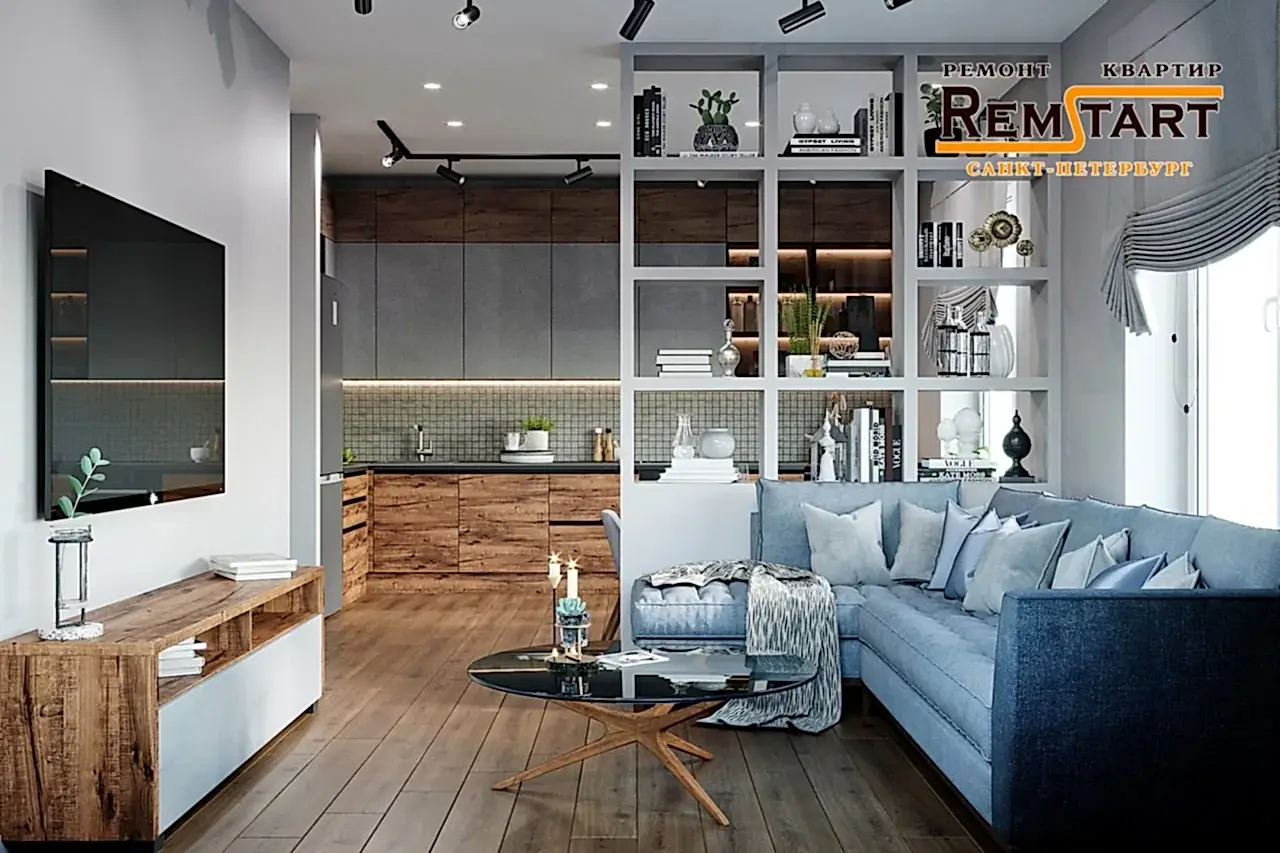 В проекте открытая планировка совмещенной гостиной и Pin Up Они объединены и отграничены друг от друга лишь открытой перегородкой в виде стеллажа, кухня зонирована на обеденную и рабочую зоны.
