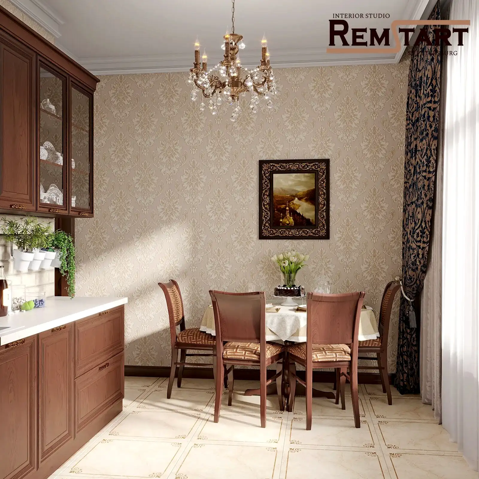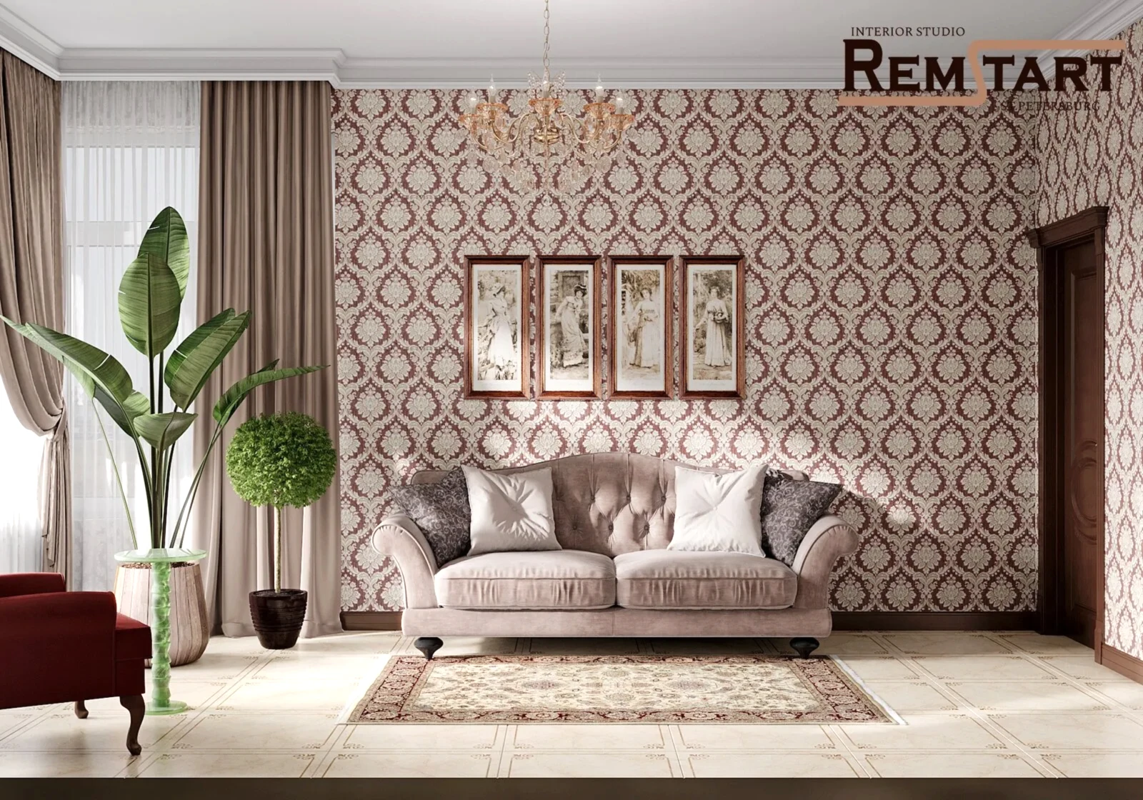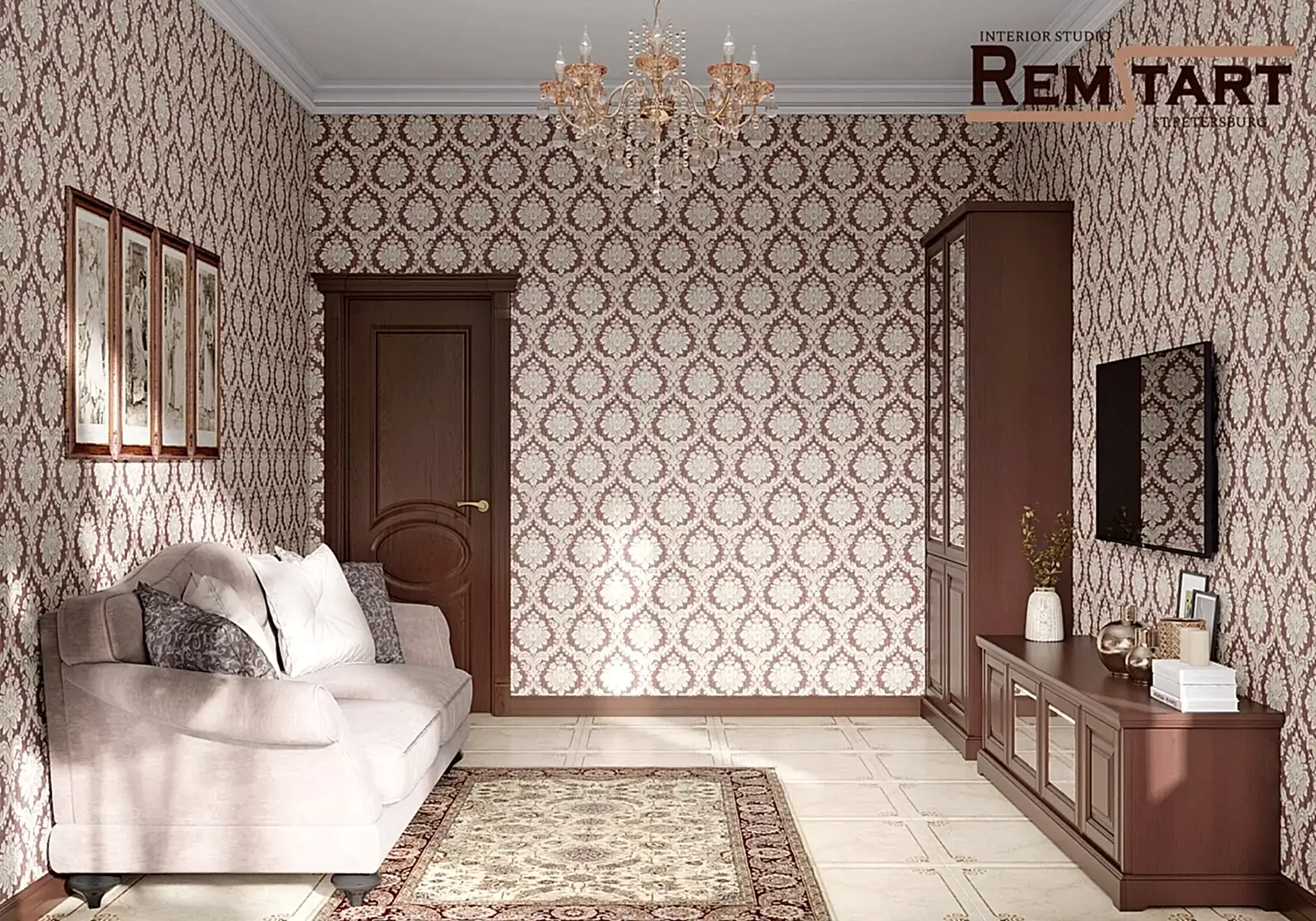 Заказчицей предстоящегоремонта квартиры в Астанеявляется женщина средних лет. Она обратилась к нам с просьбой сделать Pin Up в классическом стиле и вписать туда мебель, которая у нее уже была - буфет, ТВ тумба, столик из оникса, люстры тоже уже были приобретены.