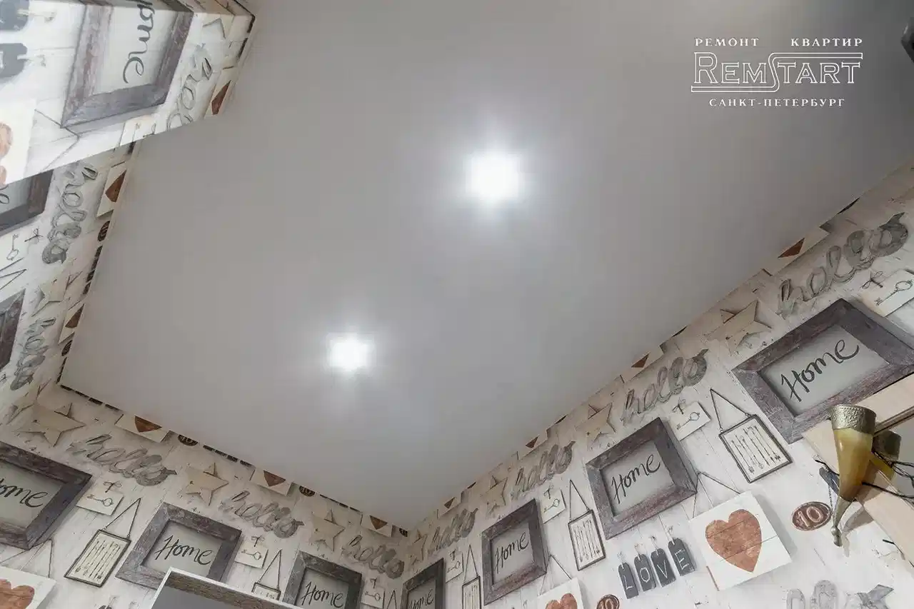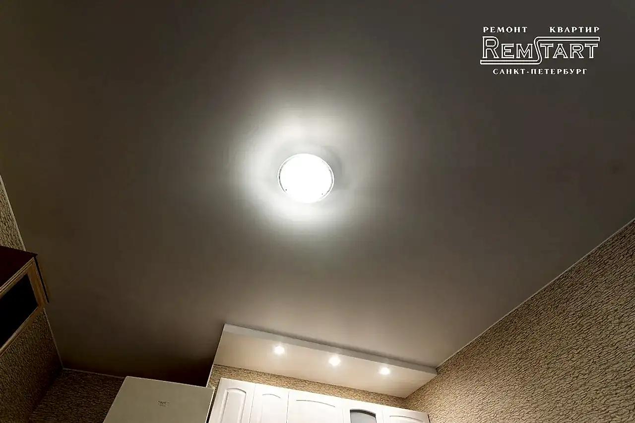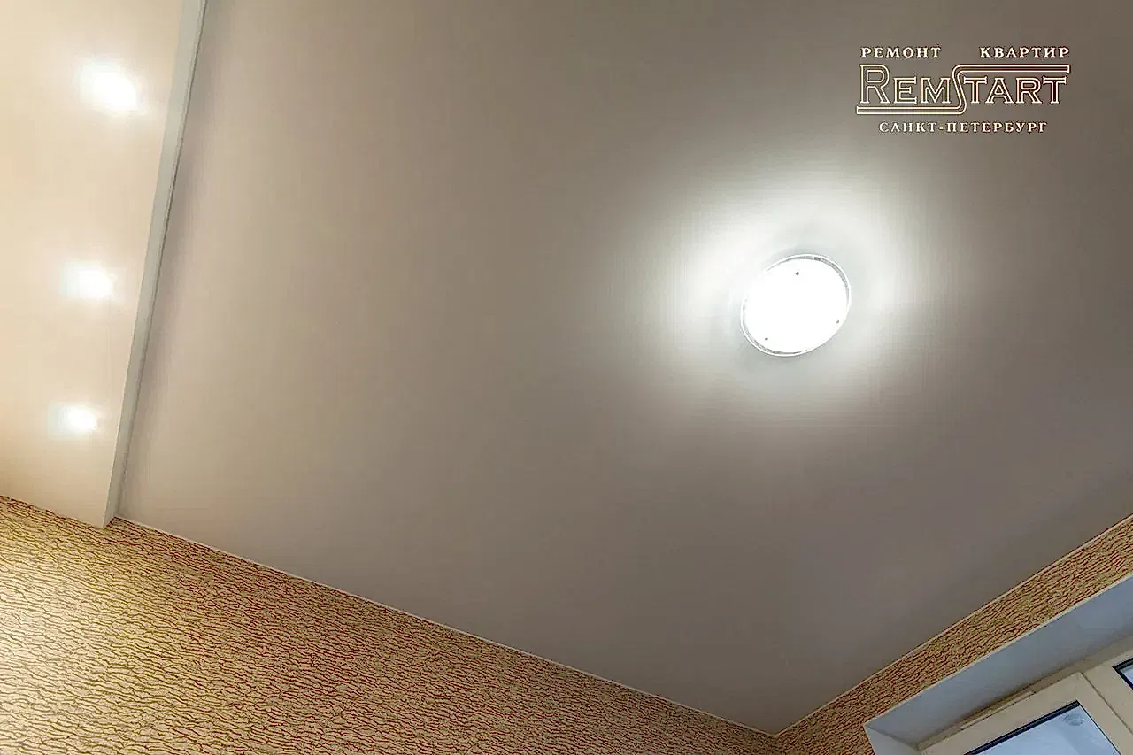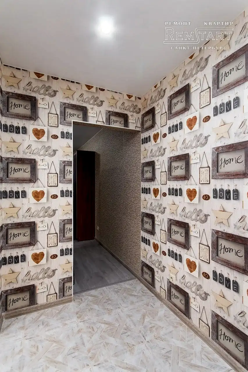 Выполненасистема водопровода, финишная доработка стен шпаклевкой и наклейка обоев. На пол Pin Up ламинат и бюджетный керамогранит. Потолок во всей квартире натяжной.