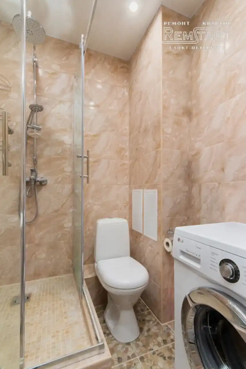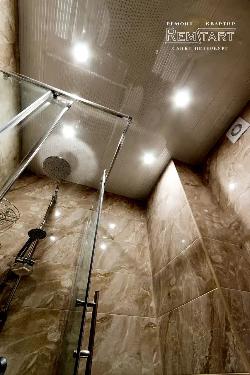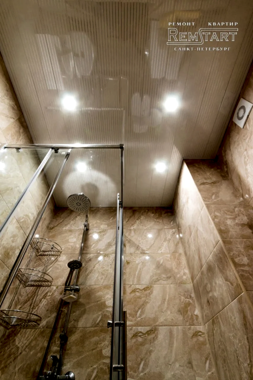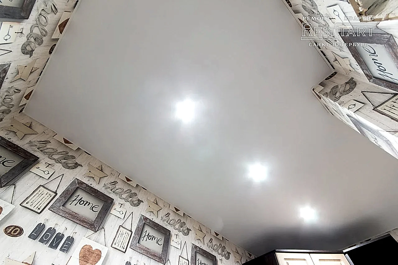 Выполненасистема водопровода, финишная доработка стен шпаклевкой и наклейка обоев. На пол Pin Up ламинат и бюджетный керамогранит. Потолок во всей квартире натяжной.